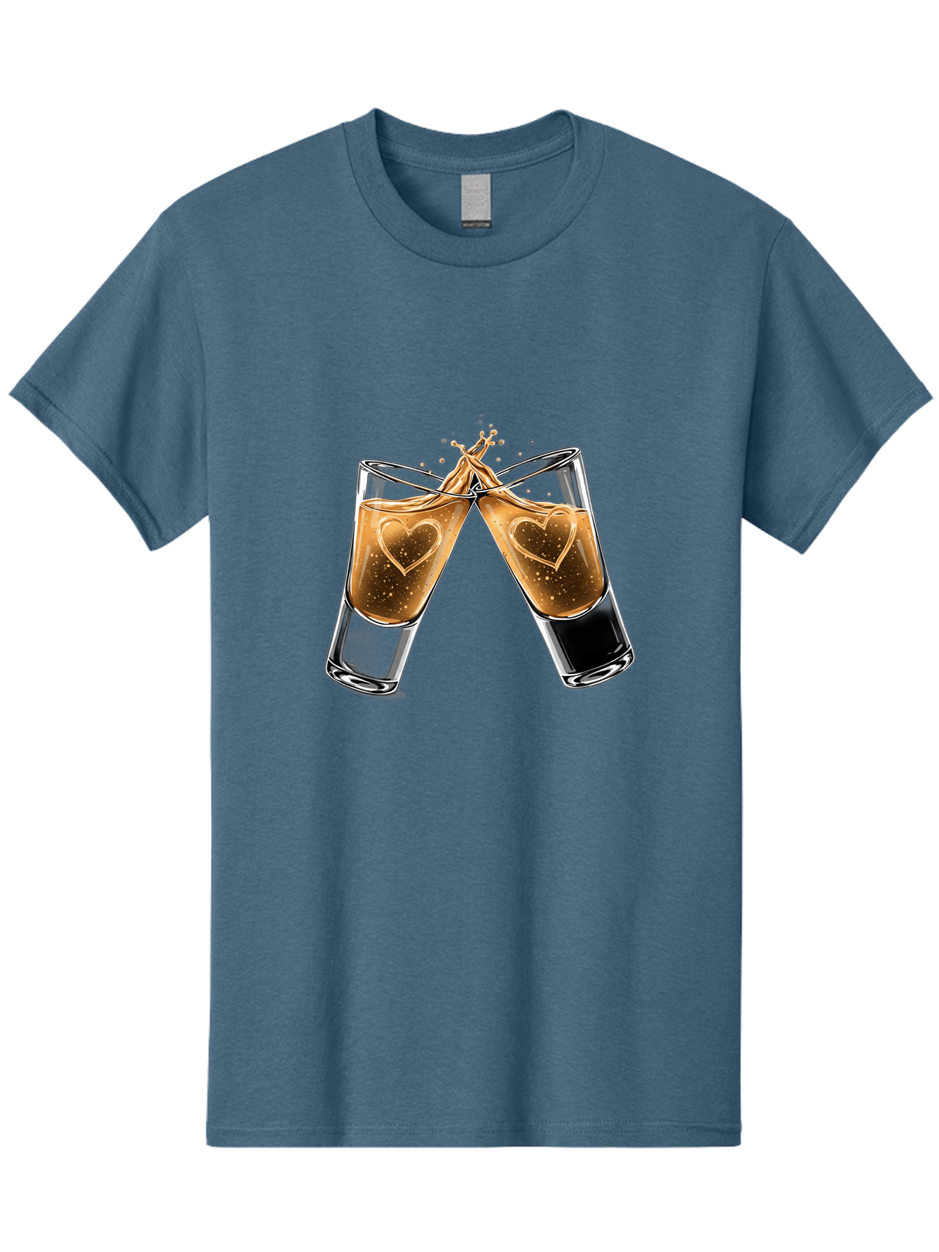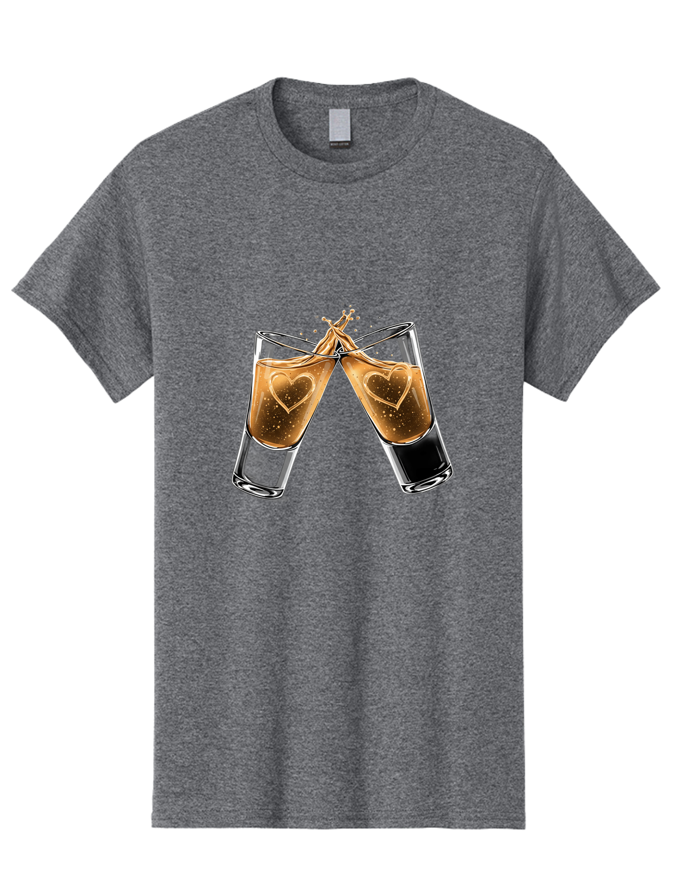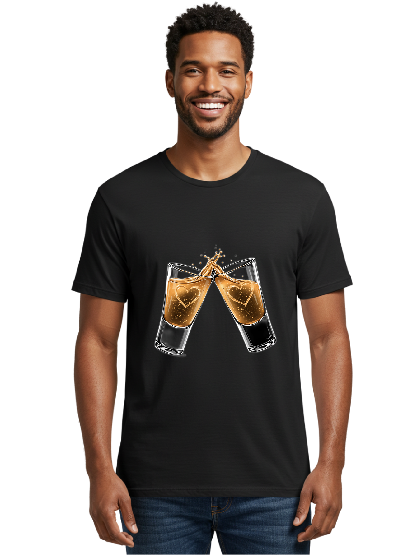 clinking-liquor-glasses Men's Graphic Tee, 100% Cotton, Comfortable Casual Summer Wear, Machine Washable, two shot glasses, cheers, toast, celebratory drink, love, heart shape, whiskey, cocktail, party, celebration, festive atmosphere BAA332