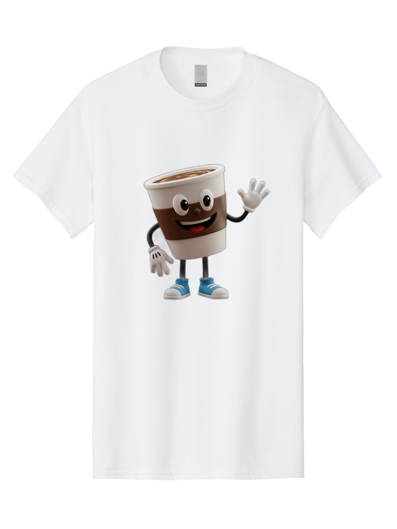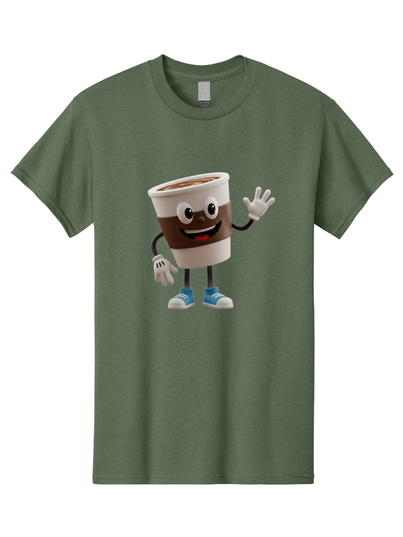 coffee-cup-character Men's Graphic Tee, 100% Cotton, Comfortable Casual Summer Wear, Machine Washable, cartoon coffee cup, happy face, waving hand, blue sneakers, coffee lover, morning pick-me-up, animated beverage, friendly character, humorous illustration, coffee break BAA362
