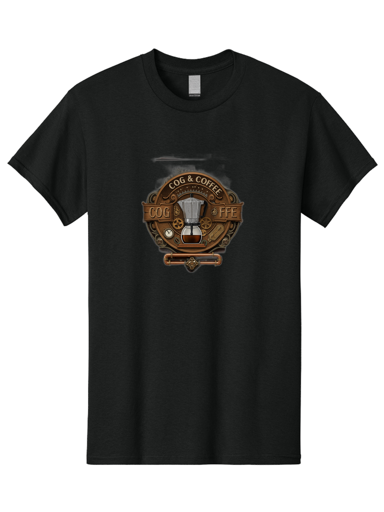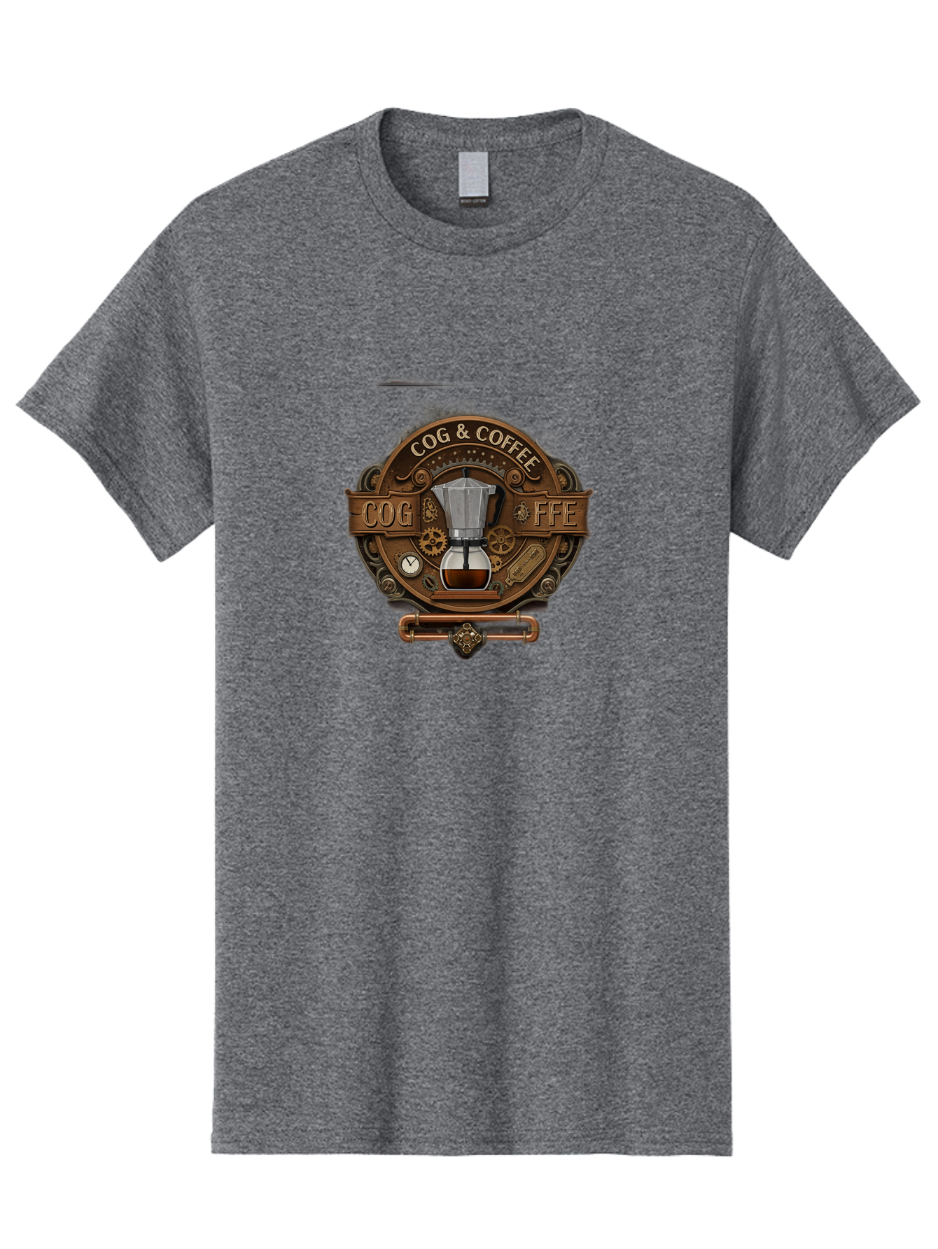 cog-coffee Men's Graphic Tee, 100% Cotton, Comfortable Casual Summer Wear, Machine Washable, steampunk coffee maker, coffee culture, industrial chic, gears and cogs, vintage coffee, coffee art, metalwork, steampunk design, COG & COFFEE logo BAA383