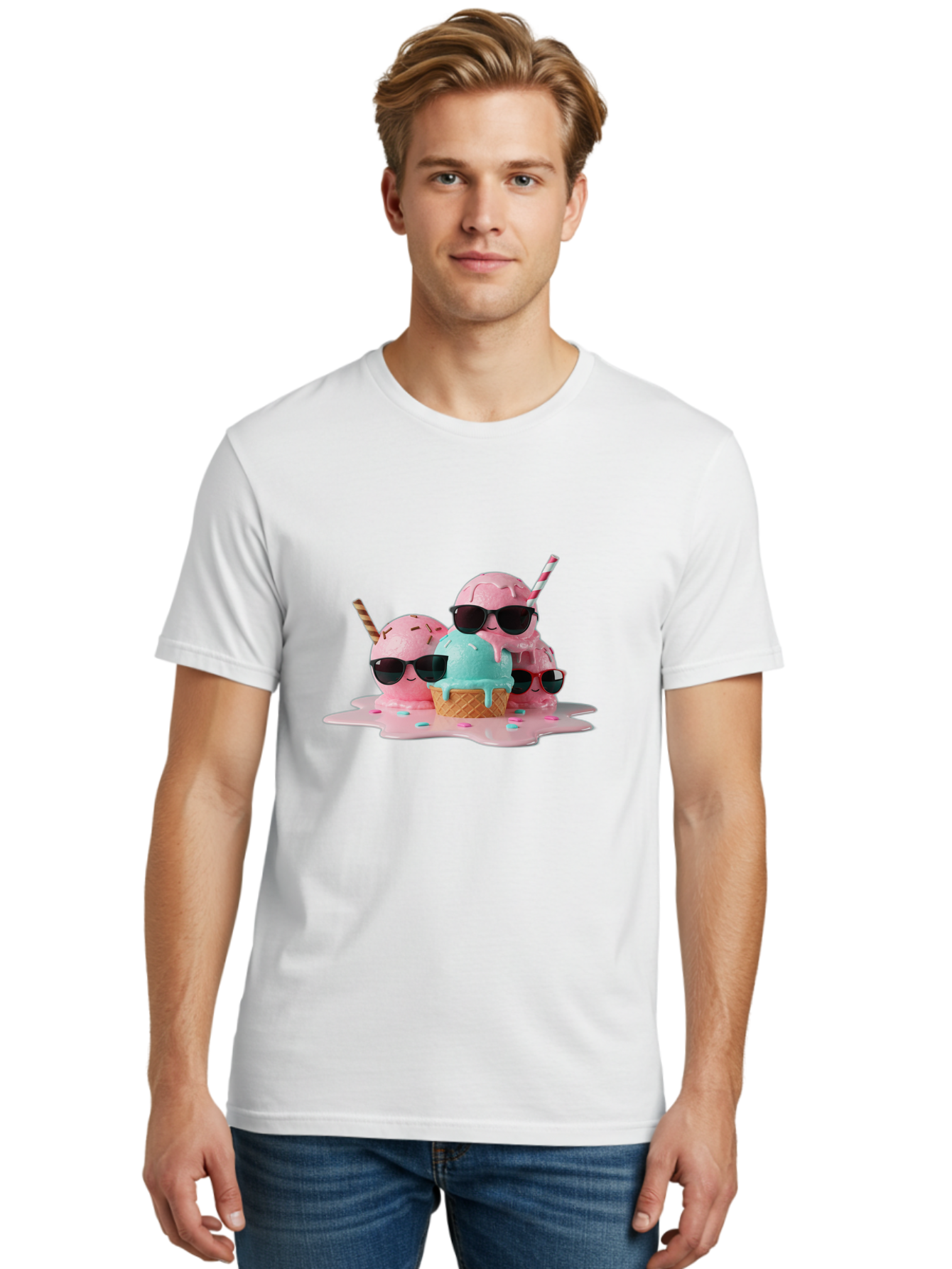 Cool-Ice-Cream Men'S Graphic Tee, 100% Cotton, Comfortable Casual Summer Wear, Machine Washable, Cool Ice Cream, Sunglasses, Pink Ice Cream, Melting Ice Cream, Blue Ice Cream, Sprinkles, Summer Treat, Sweet Dessert, Fun Snack, Cold Treat, Baa403