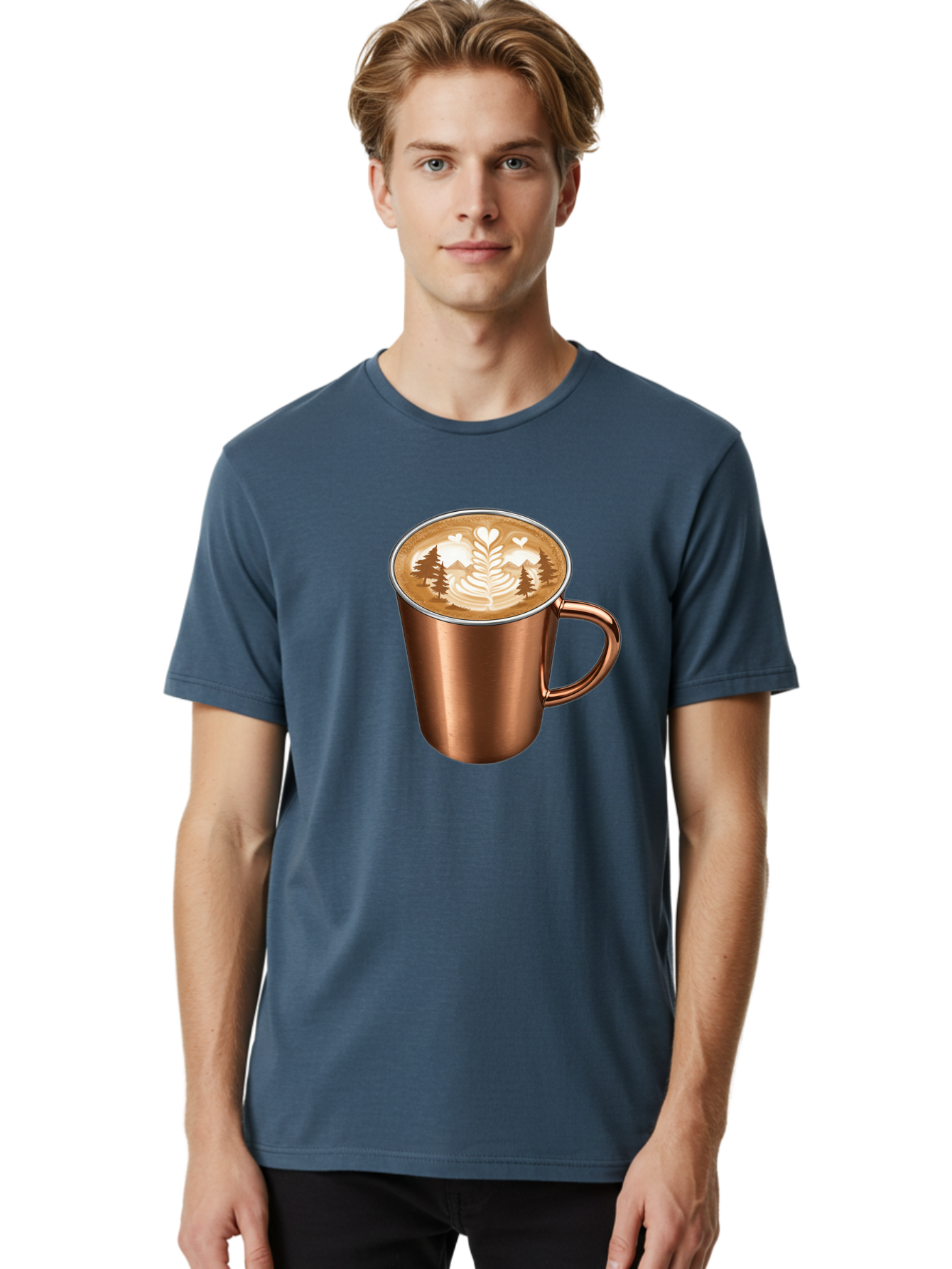 copper-coffee-mug Men's Graphic Tee, 100% Cotton, Comfortable Casual Summer Wear, Machine Washable, latte art, coffee drink, copper mug, forest design, heart-shaped leaves, coffee culture, specialty coffee, beverage, morning coffee BAA404