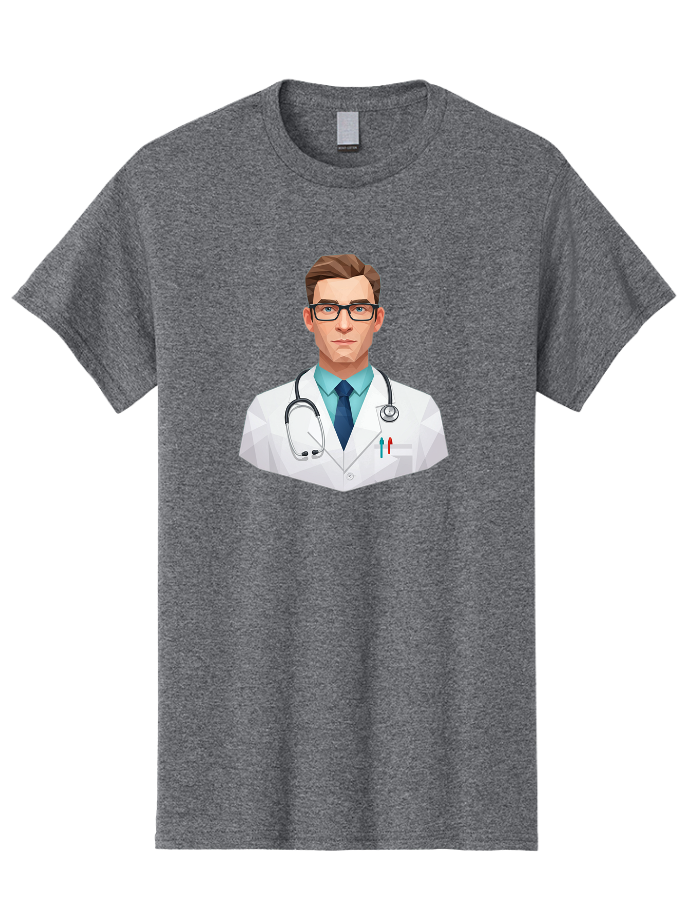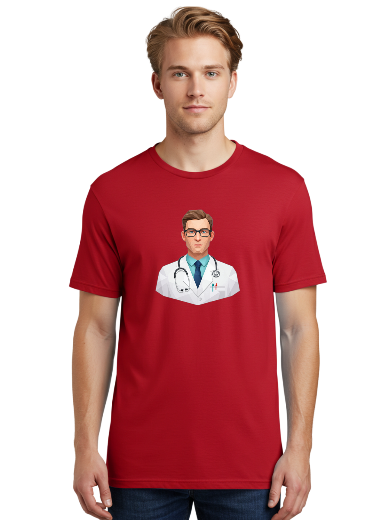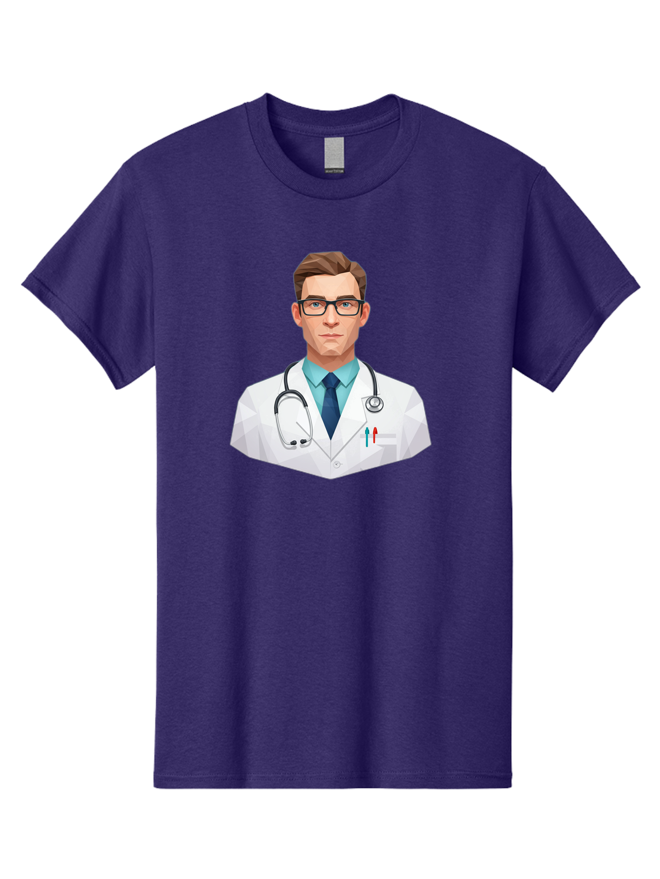 doctor-4 Men's Graphic Tee, 100% Cotton, Comfortable Casual Summer Wear, Machine Washable, male doctor, medical professional, stethoscope around neck, white lab coat, blue shirt, dark blue tie, pens in pocket, glasses, low poly style, cartoon character BAA459