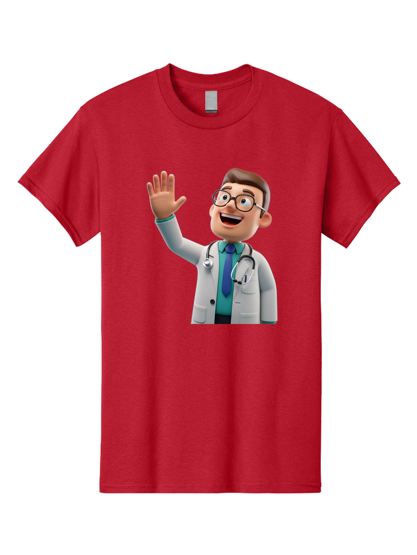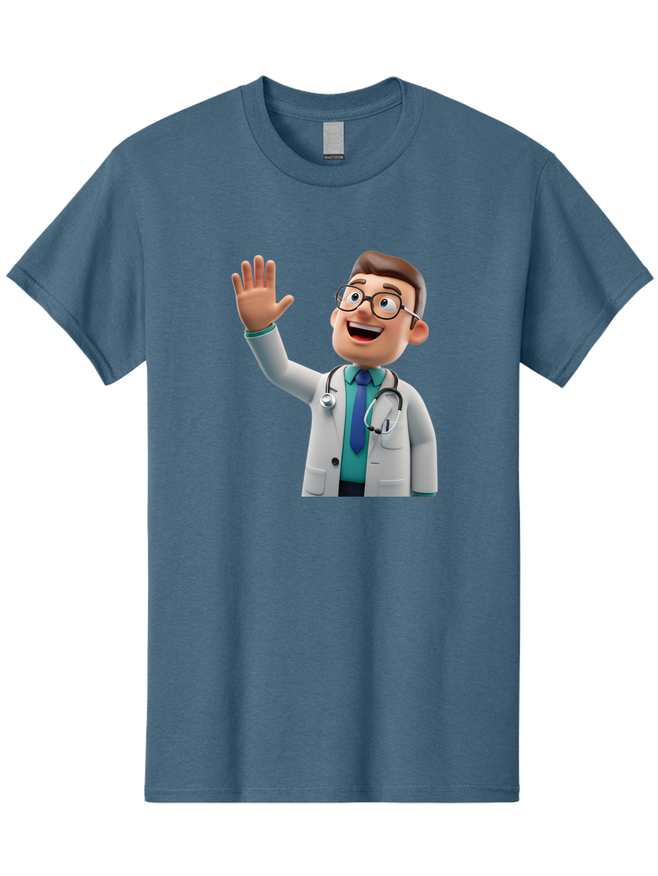 Doctor-Waving-1 Men'S Graphic Tee, 100% Cotton, Comfortable Casual Summer Wear, Machine Washable, Cartoon Doctor, Waving Hand, Friendly Gesture, Medical Professional, Stethoscope Around Neck, White Lab Coat, Blue Tie, Smiling Face, Baa484
