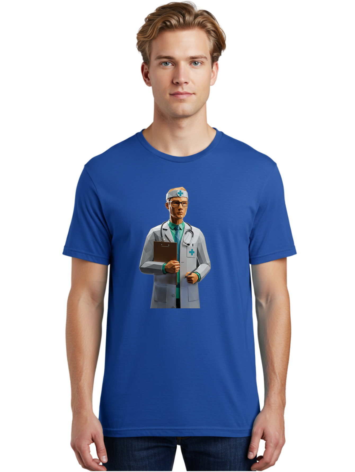 doctor-with-clipboard Men's Graphic Tee, 100% Cotton, Comfortable Casual Summer Wear, Machine Washable, male doctor, white lab coat, blue cross, stethoscope, clipboard, medical professional, healthcare worker, glasses, serious expression, professional attire BAA489
