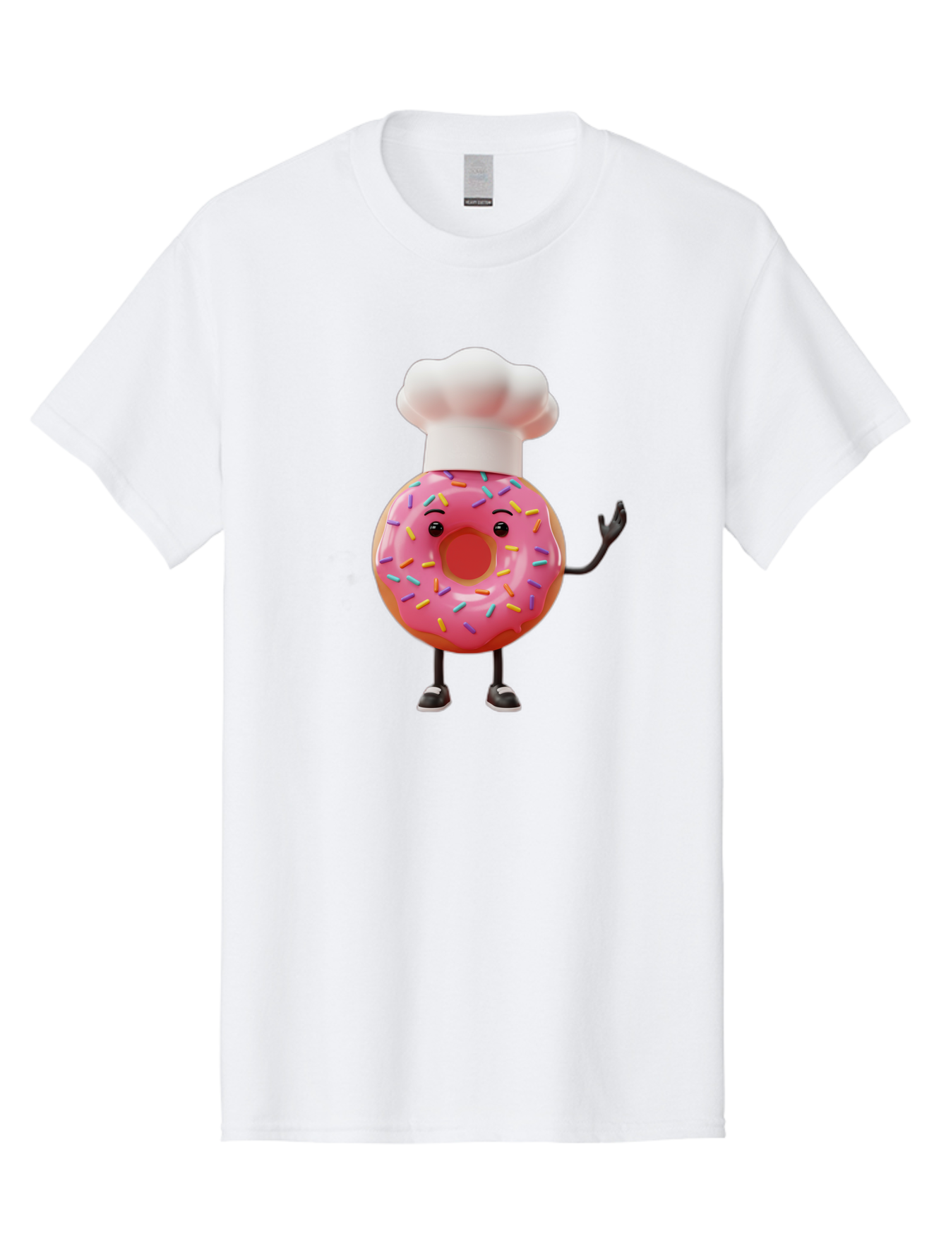 donut-chef Men's Graphic Tee, 100% Cotton, Comfortable Casual Summer Wear, Machine Washable, pink donut with sprinkles, chef hat, cartoon character, sweet treat, bakery illustration, 3D rendering, colorful pastel, playful design, waving gesture, chef's attire, cute mascot, dessert icon, fun anthropomorphism, digital art BAA503