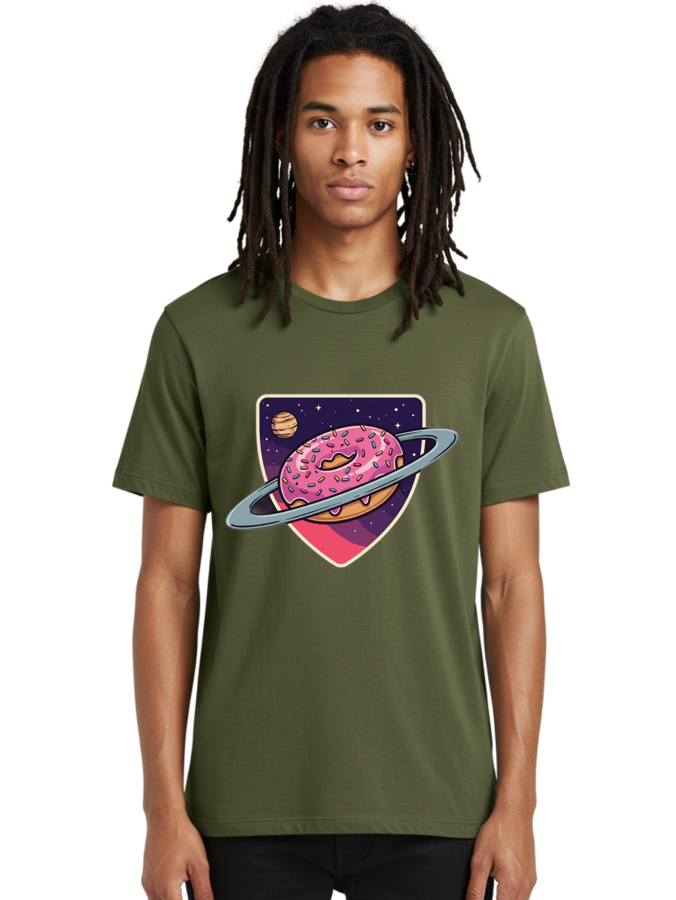 donut-planet Men's Graphic Tee, 100% Cotton, Comfortable Casual Summer Wear, Machine Washable, donut saturn, pink frosted donut, sprinkles, ringed donut, planet, stars, purple shield, whimsical, fantastical, surreal, dessert art, sweet treats, cosmic, space-themed, creative, playful, fun BAA510