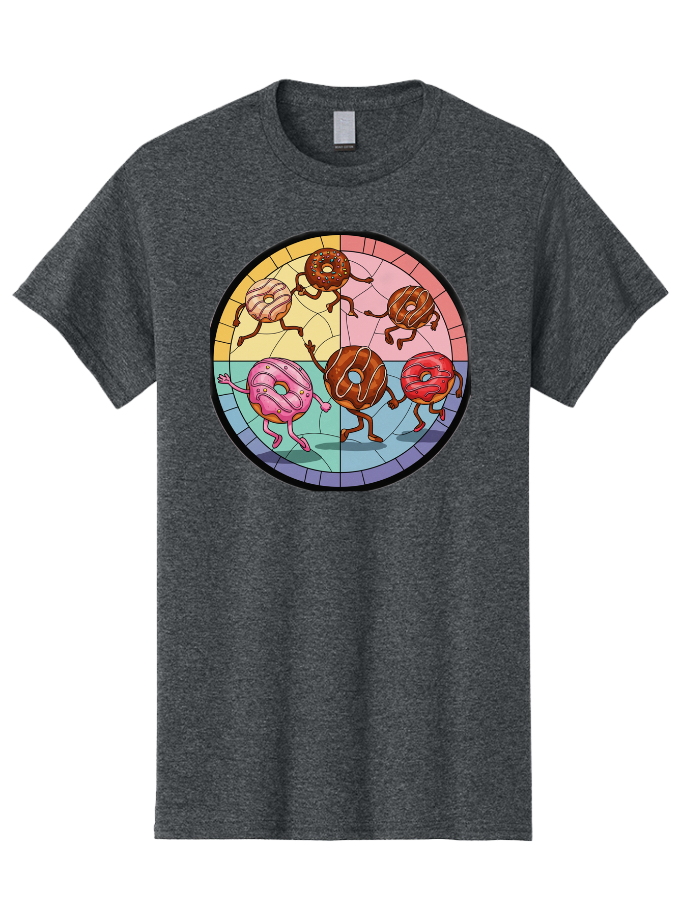 donuts-dancing-1 Men's Graphic Tee, 100% Cotton, Comfortable Casual Summer Wear, Machine Washable, donuts dancing, cartoon donuts, sweet treats, colorful illustration, playful art, pastry characters, whimsical design, tasty delights, donut lovers BAA522
