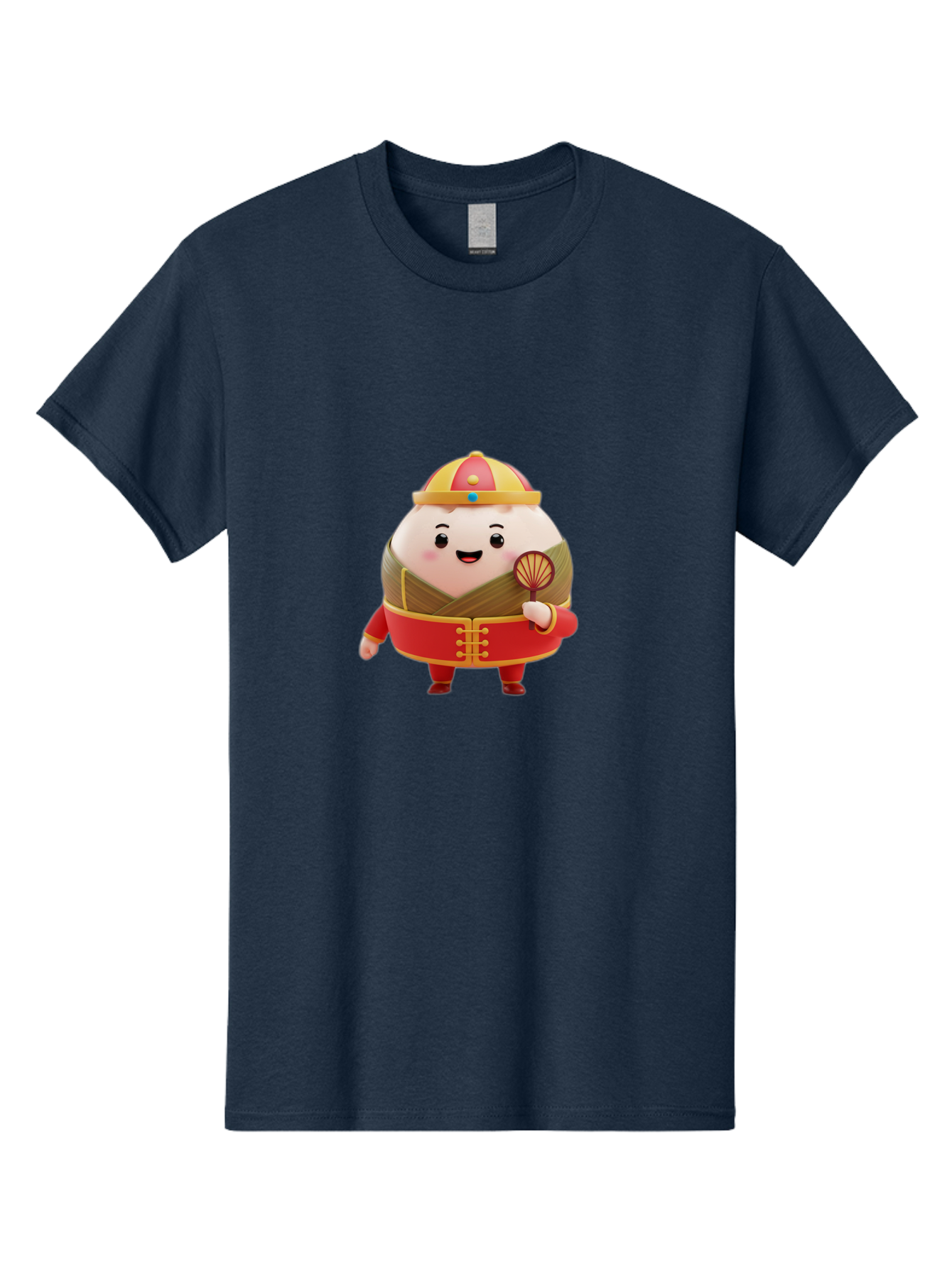 dumpling-character Men's Graphic Tee, 100% Cotton, Comfortable Casual Summer Wear, Machine Washable, cartoon dumpling, traditional chinese clothing, red and gold attire, smiling face, holding fan, cute character, chinese culture, cartoon style, dumpling costume, joyful expression BAA568