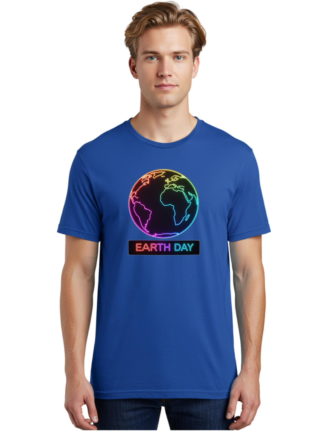 earth-day-1 Men's Graphic Tee, 100% Cotton, Comfortable Casual Summer Wear, Machine Washable, Earth Day, planet Earth, globe, neon lights, colorful graphics, environmental awareness, conservation, sustainability, eco-friendly, world map BAA573