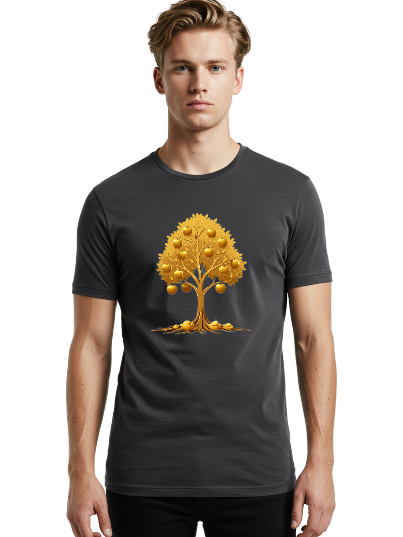 golden-apple-tree Men's Graphic Tee, 100% Cotton, Comfortable Casual Summer Wear, Machine Washable, golden apple tree, fruiting tree, lush foliage, abundant harvest, tree roots, golden apples, autumnal theme, symbol of prosperity BAA766