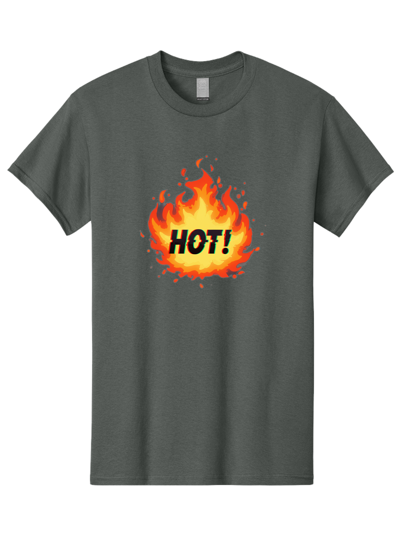 hot-12 Men's Graphic Tee, 100% Cotton, Comfortable Casual Summer Wear, Machine Washable, yellow and orange flame, fire graphic, HOT text, bold font, intense heat, fiery illustration, dramatic design, splattered flames BAA800