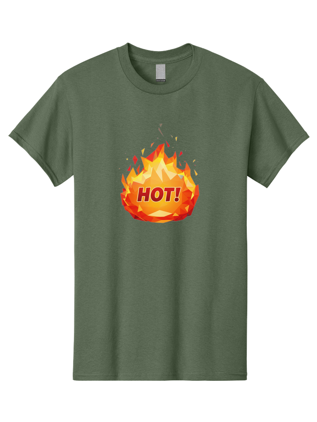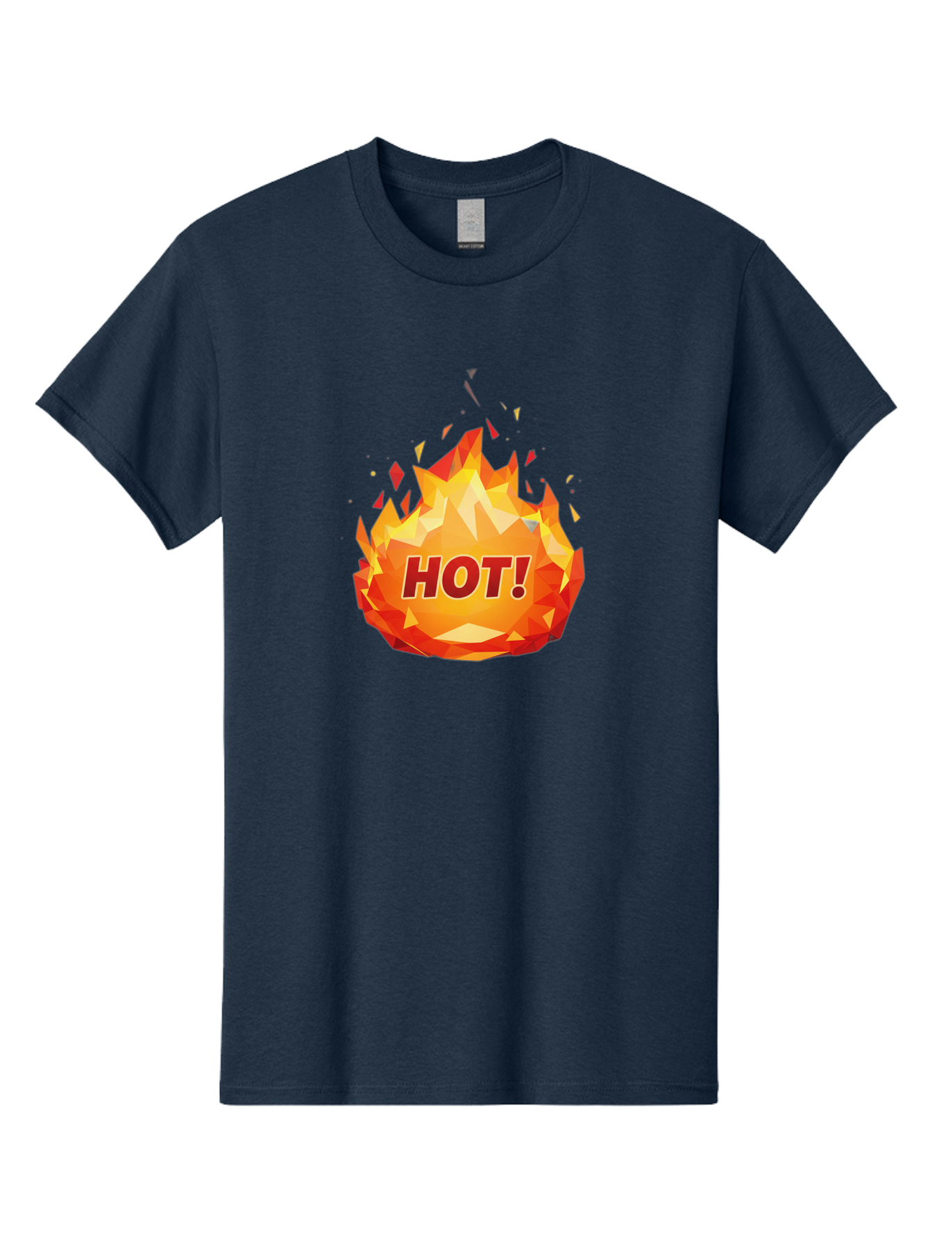 hot-6 Men's Graphic Tee, 100% Cotton, Comfortable Casual Summer Wear, Machine Washable, hot badge, fiery emblem, orange flames, bold text, HOT!, burning effect, vibrant graphics, attention-grabbing design, fiery graphics, explosive badge BAA805