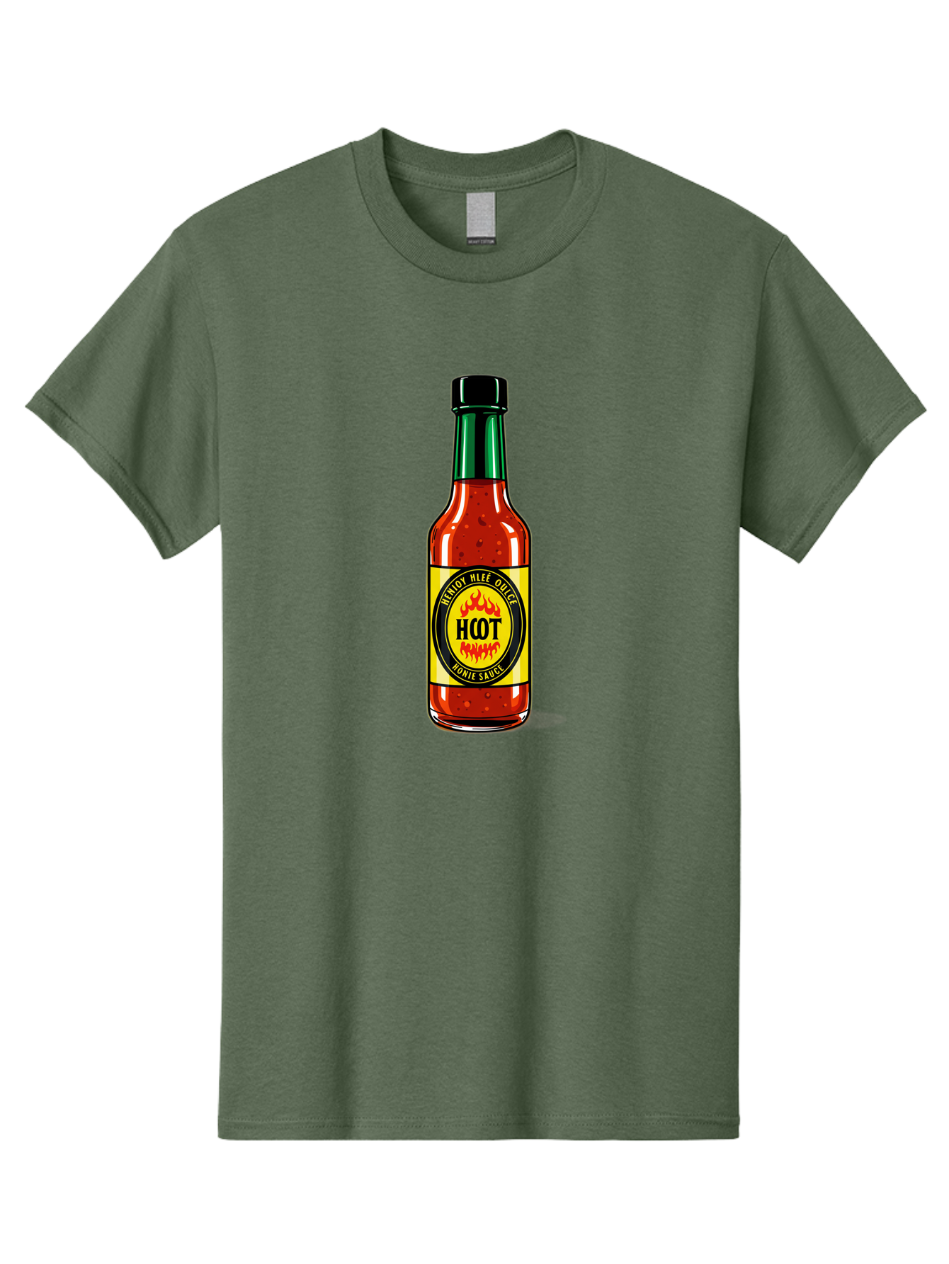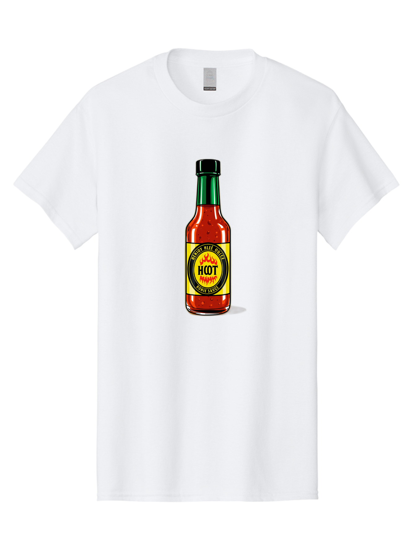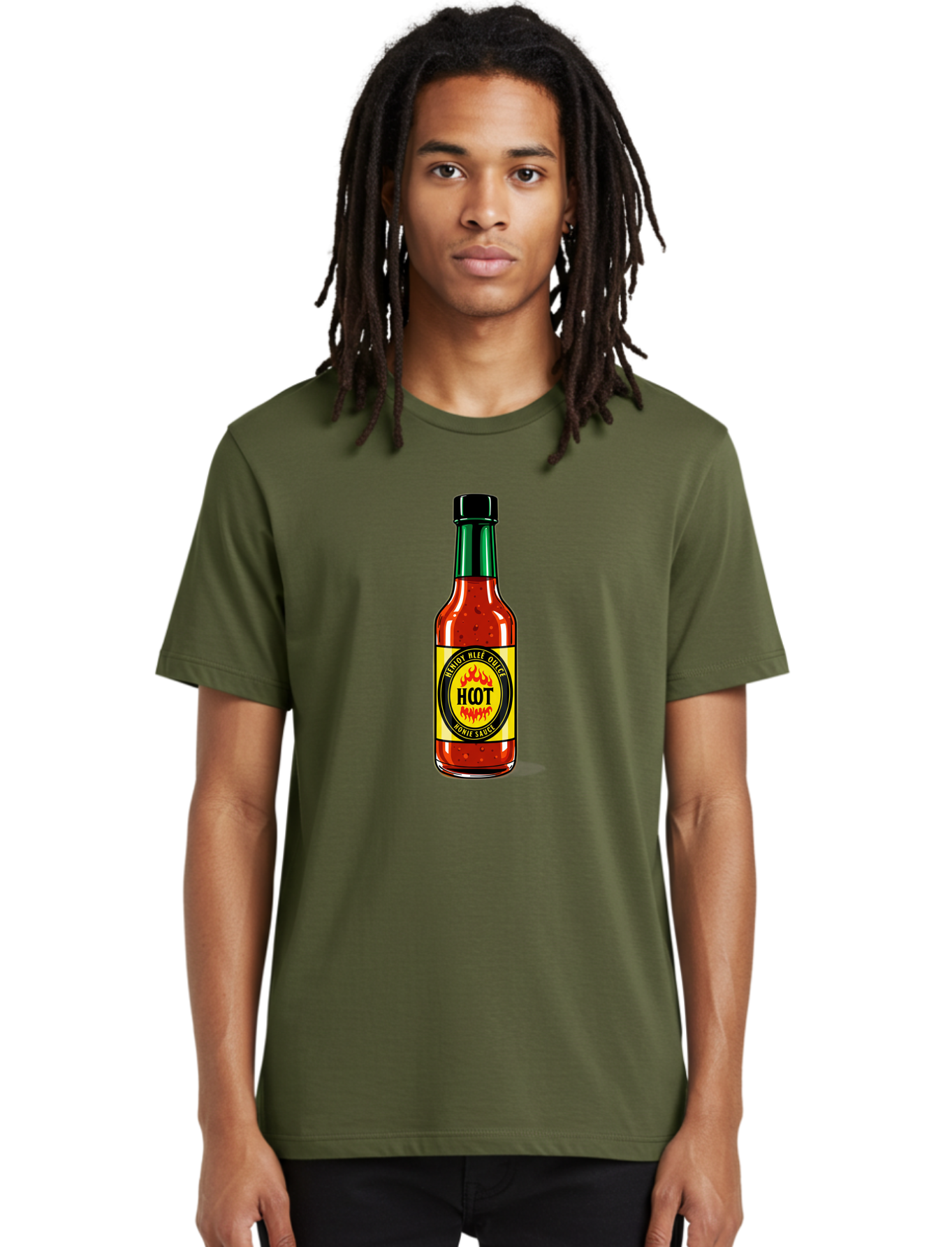 hot-hot-sauce Men's Graphic Tee, 100% Cotton, Comfortable Casual Summer Wear, Machine Washable, hot sauce bottle, spicy condiment, red sauce, black cap, bold label, BRIAN MEE DUKE, flavorful kick, culinary delight, condiment, hot Bomie sauce BAA810