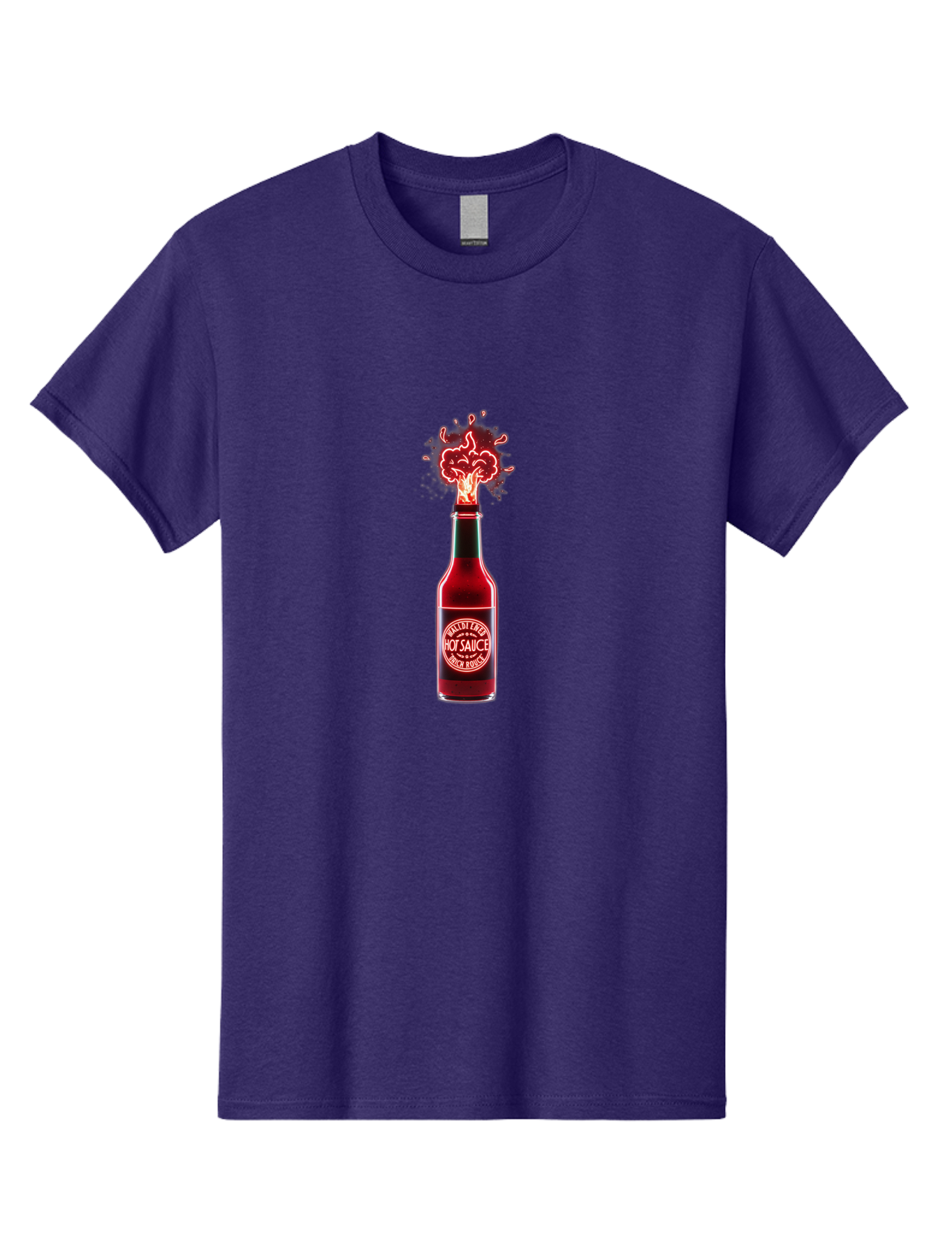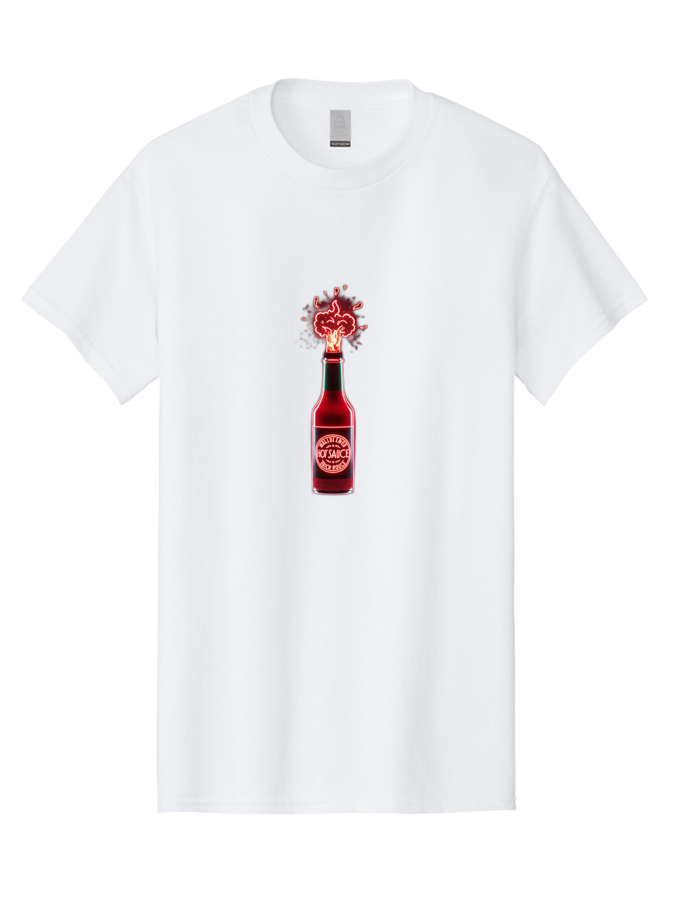 hot-sauce-1 Men's Graphic Tee, 100% Cotton, Comfortable Casual Summer Wear, Machine Washable, hot sauce bottle, spicy condiment, fiery explosion, condiment bottle, hot sauce label, spicy food, chili peppers, sauce bottle BAA812