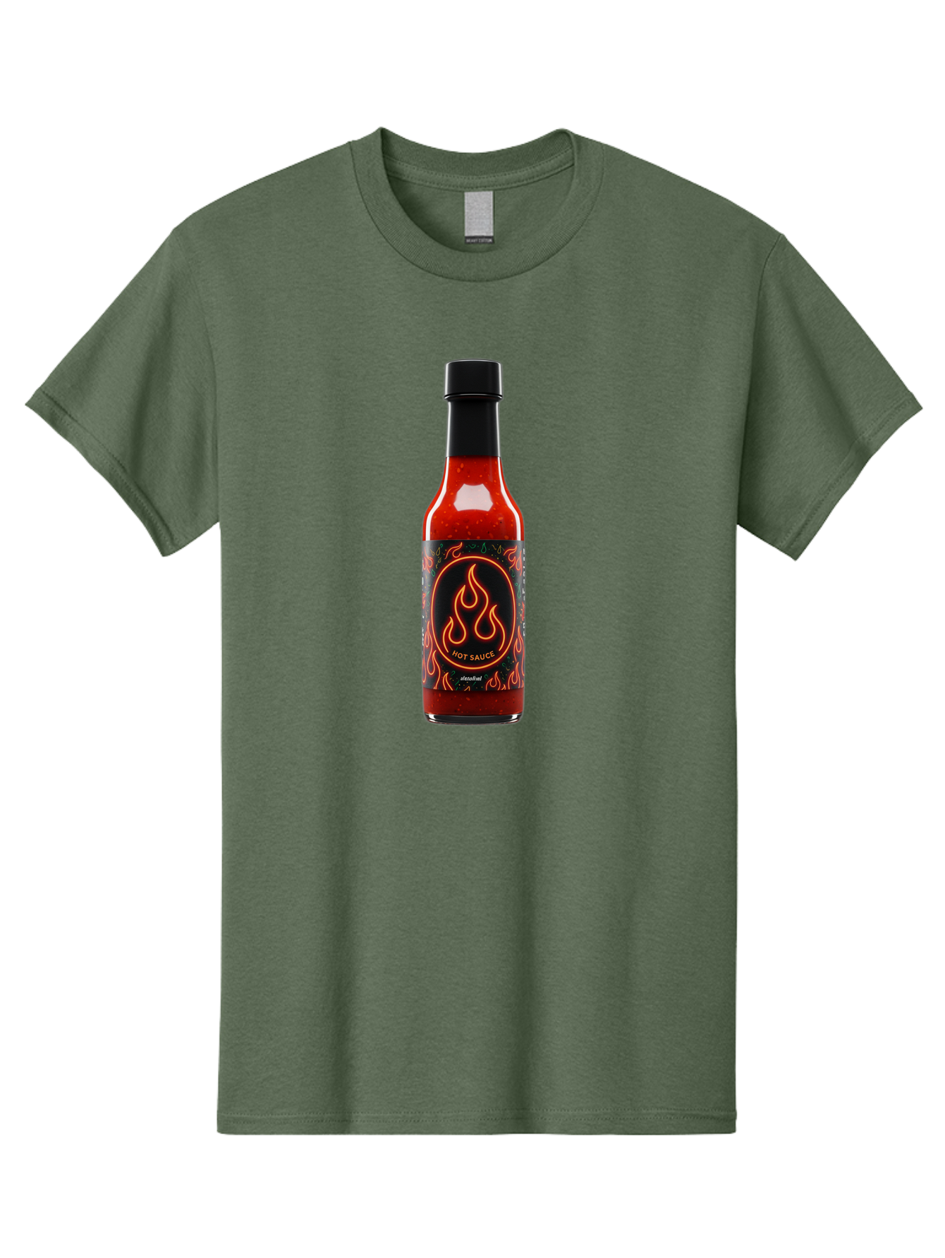 hot-sauce-2 Men's Graphic Tee, 100% Cotton, Comfortable Casual Summer Wear, Machine Washable, hot sauce, spicy condiment, chili peppers, red sauce, glass bottle, black cap, flame design, hot sauce bottle, condiment bottle, spicy food BAA814