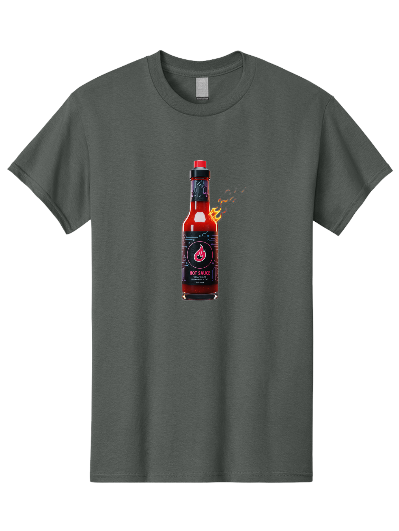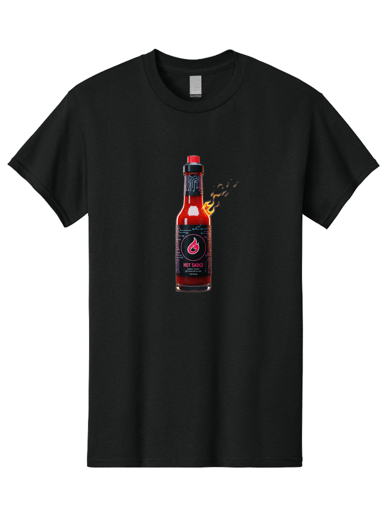 hot-sauce-5 Men's Graphic Tee, 100% Cotton, Comfortable Casual Summer Wear, Machine Washable, hot sauce bottle, spicy condiment, chili pepper sauce, fiery flavor, red sauce, black label, circuit design, flames BAA817