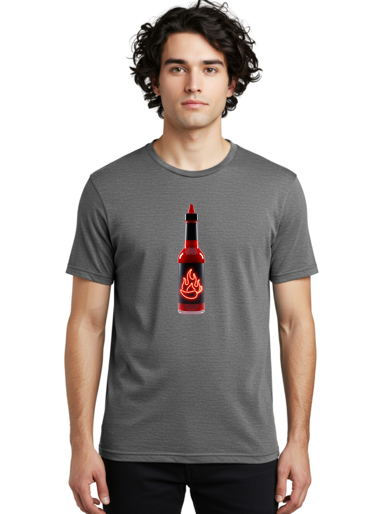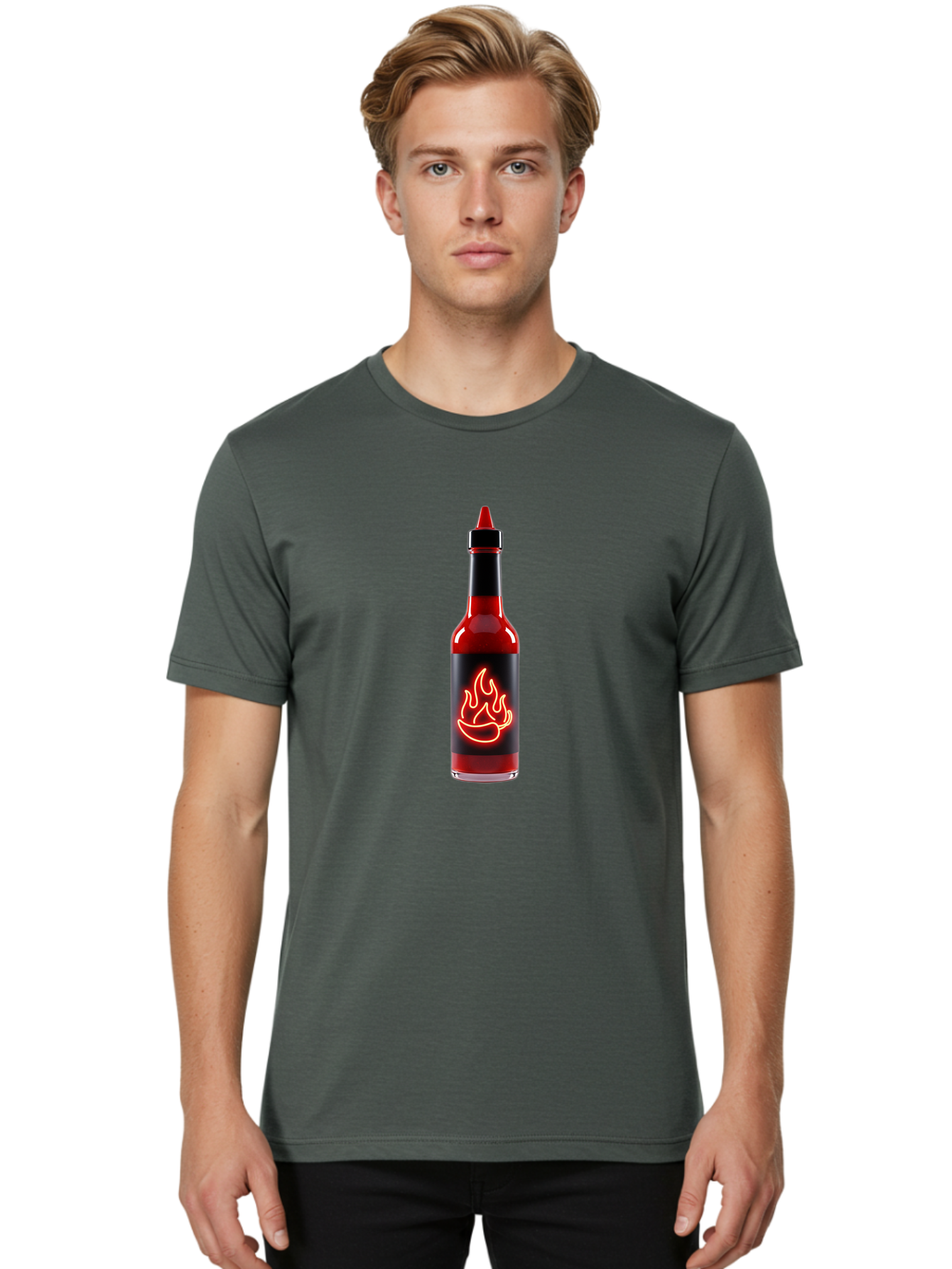 hot-sauce-bottle-9 Men's Graphic Tee, 100% Cotton, Comfortable Casual Summer Wear, Machine Washable, hot sauce, spicy condiment, chili peppers, fiery flavor, red sauce, bottle with pointed cap, neon flame design, black label BAA833