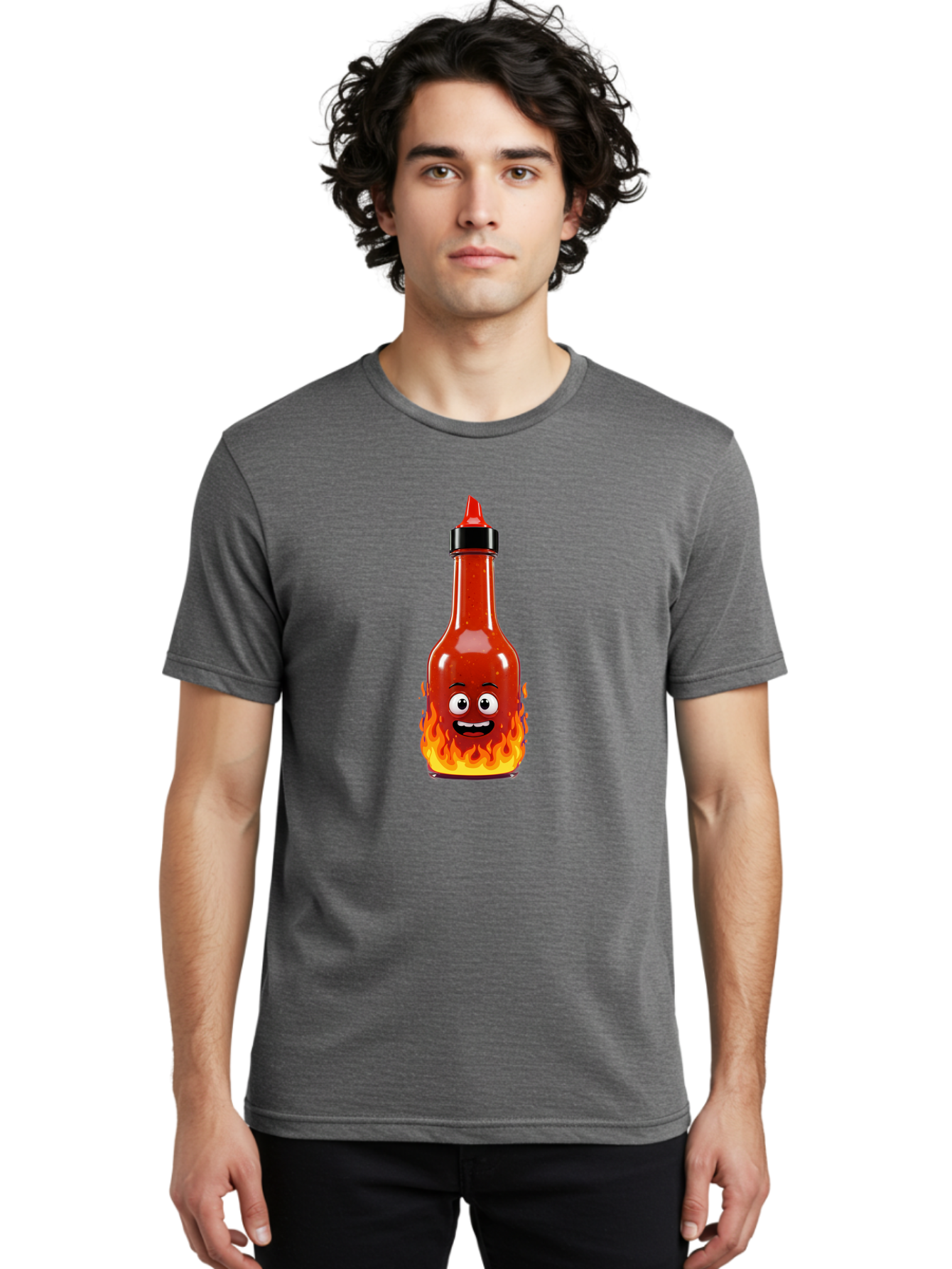 hot-sauce-bottle Men's Graphic Tee, 100% Cotton, Comfortable Casual Summer Wear, Machine Washable, hot sauce bottle, cartoon character, happy face, flames, spicy food, condiment, cartoon illustration, vibrant colors, playful design, kitchen humor BAA835