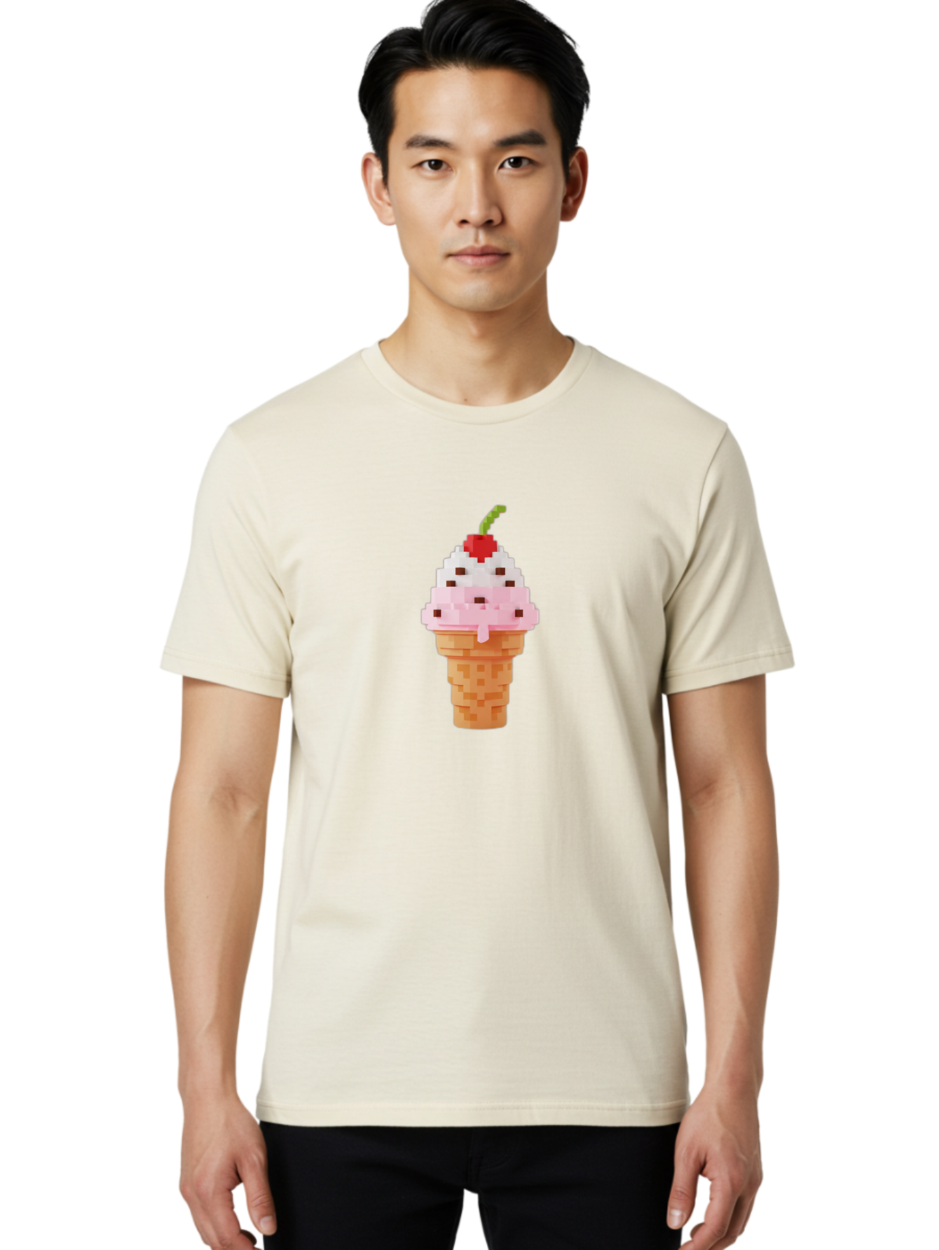 ice-cream-cone-3 Men's Graphic Tee, 100% Cotton, Comfortable Casual Summer Wear, Machine Washable, pixel art ice cream, strawberry ice cream cone, chocolate chips, melting ice cream, pixelated dessert, sweet treat, digital art, pixel graphics, ice cream lover, summertime snack BAA864