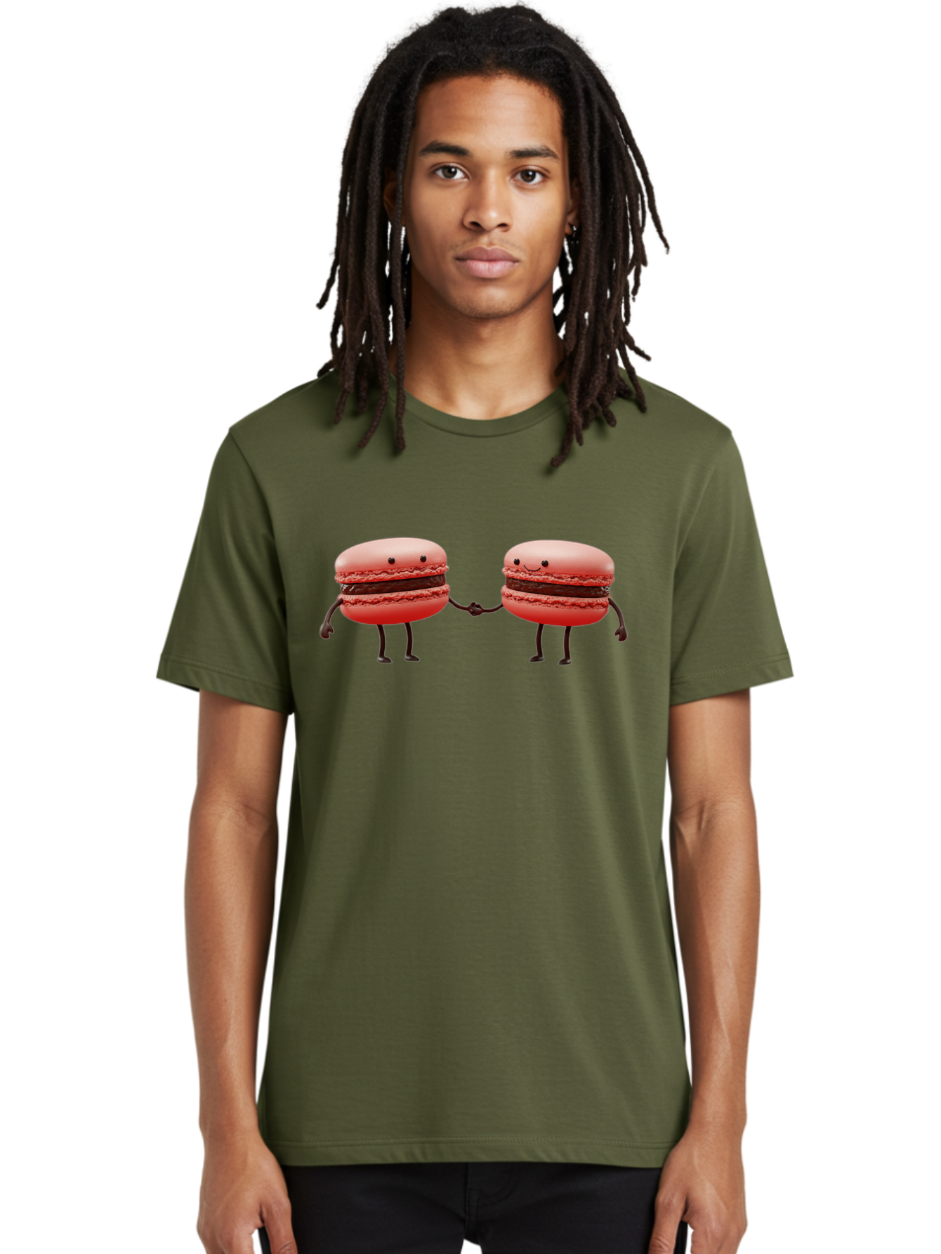 macarons-6 Men's Graphic Tee, 100% Cotton, Comfortable Casual Summer Wear, Machine Washable, cartoon macarons, holding hands, French dessert, sweet treats, adorable characters, whimsical design, playful illustration, pink macarons, friendship symbol BAA950