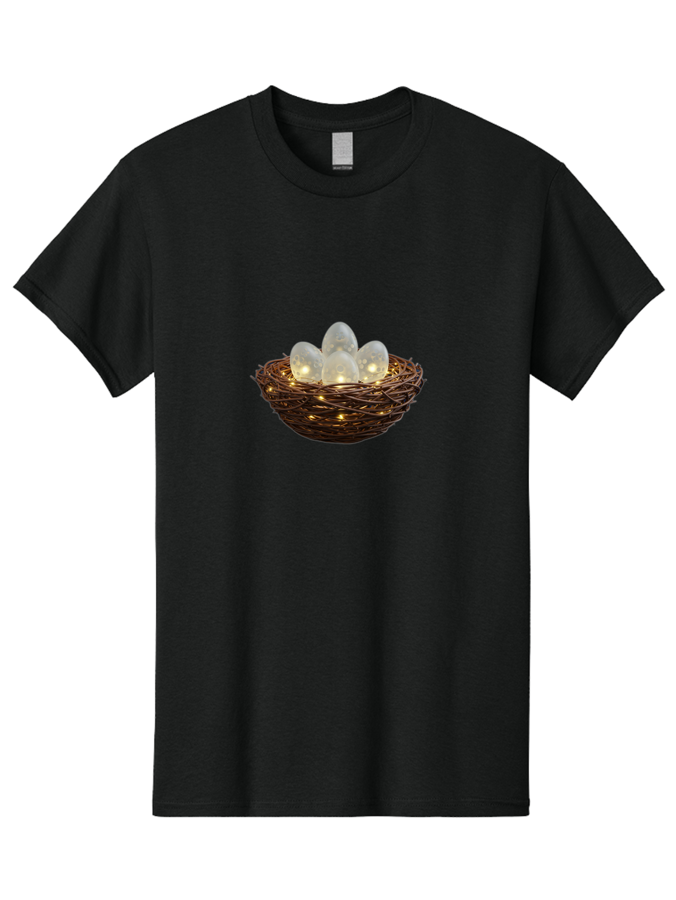 nest-with-eggs Men's Graphic Tee, 100% Cotton, Comfortable Casual Summer Wear, Machine Washable, glowing eggs in a nest, festive decor, decorative nest, twig nest, glowing orbs, string lights, home decor, Easter eggs, spring decoration BAB030