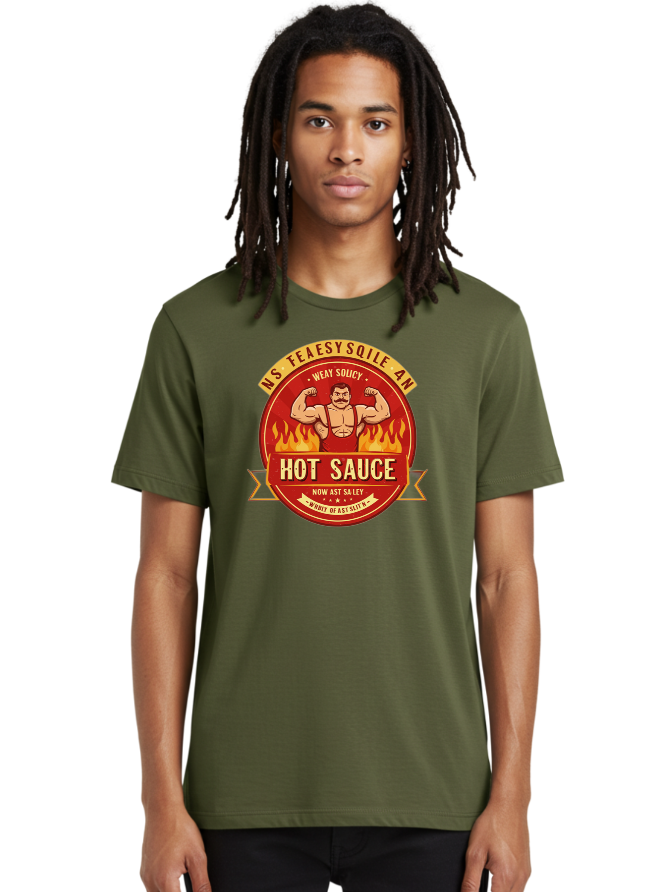 ns-feaesy-sqile-an-hot-sauce Men's Graphic Tee, 100% Cotton, Comfortable Casual Summer Wear, Machine Washable, hot sauce label, cartoon strongman, red and yellow design, fiery flames, humorous text, playful typography, spicy food, condiment packaging, retro-style advertisement, comedic illustration BAB047