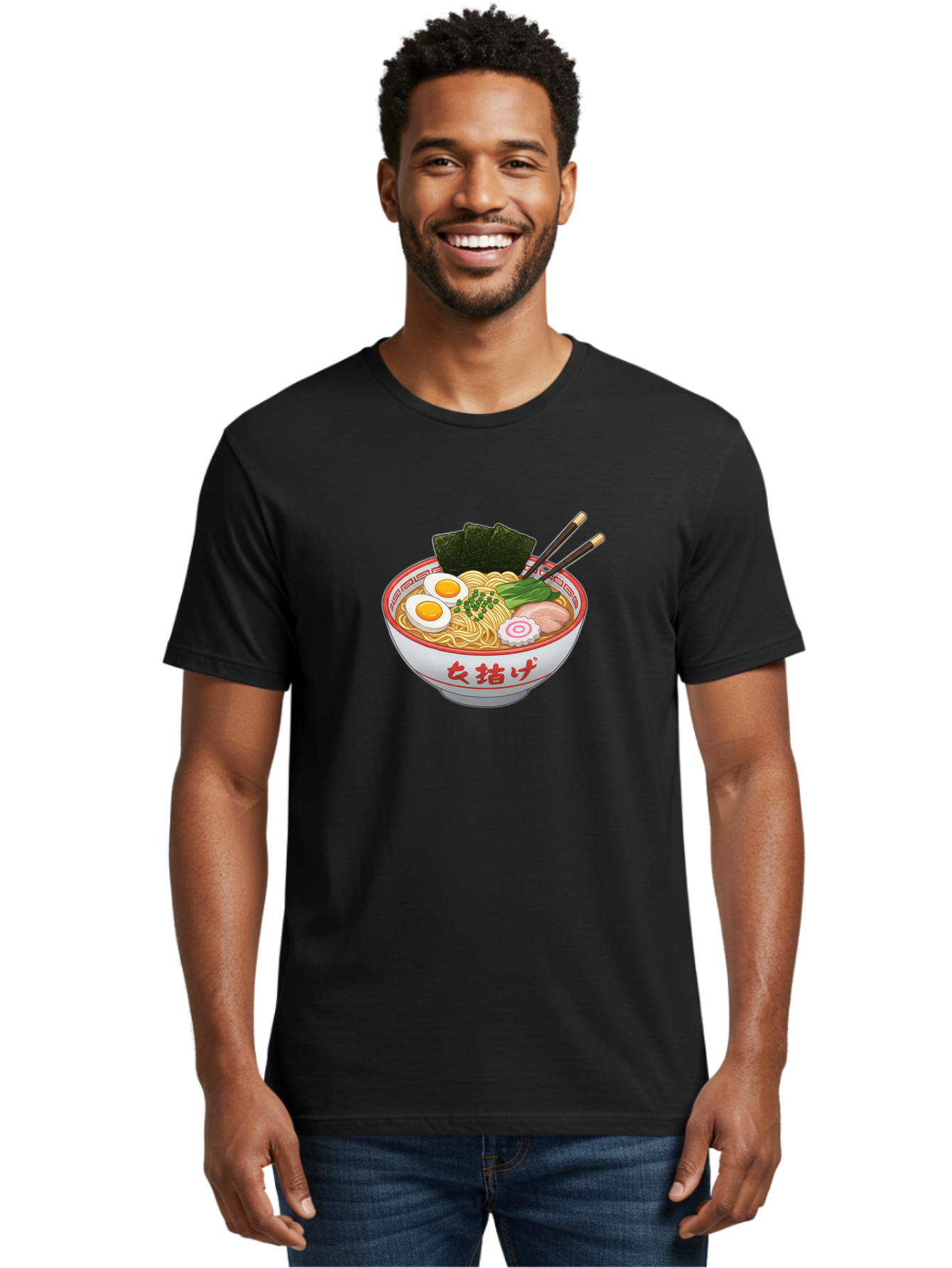 onna-jirage-ramen Men's Graphic Tee, 100% Cotton, Comfortable Casual Summer Wear, Machine Washable, ramen bowl, noodle soup, boiled egg, green onions, seaweed, pork slices, narutomaki, chopsticks, japanese cuisine, onna zuke BAB053