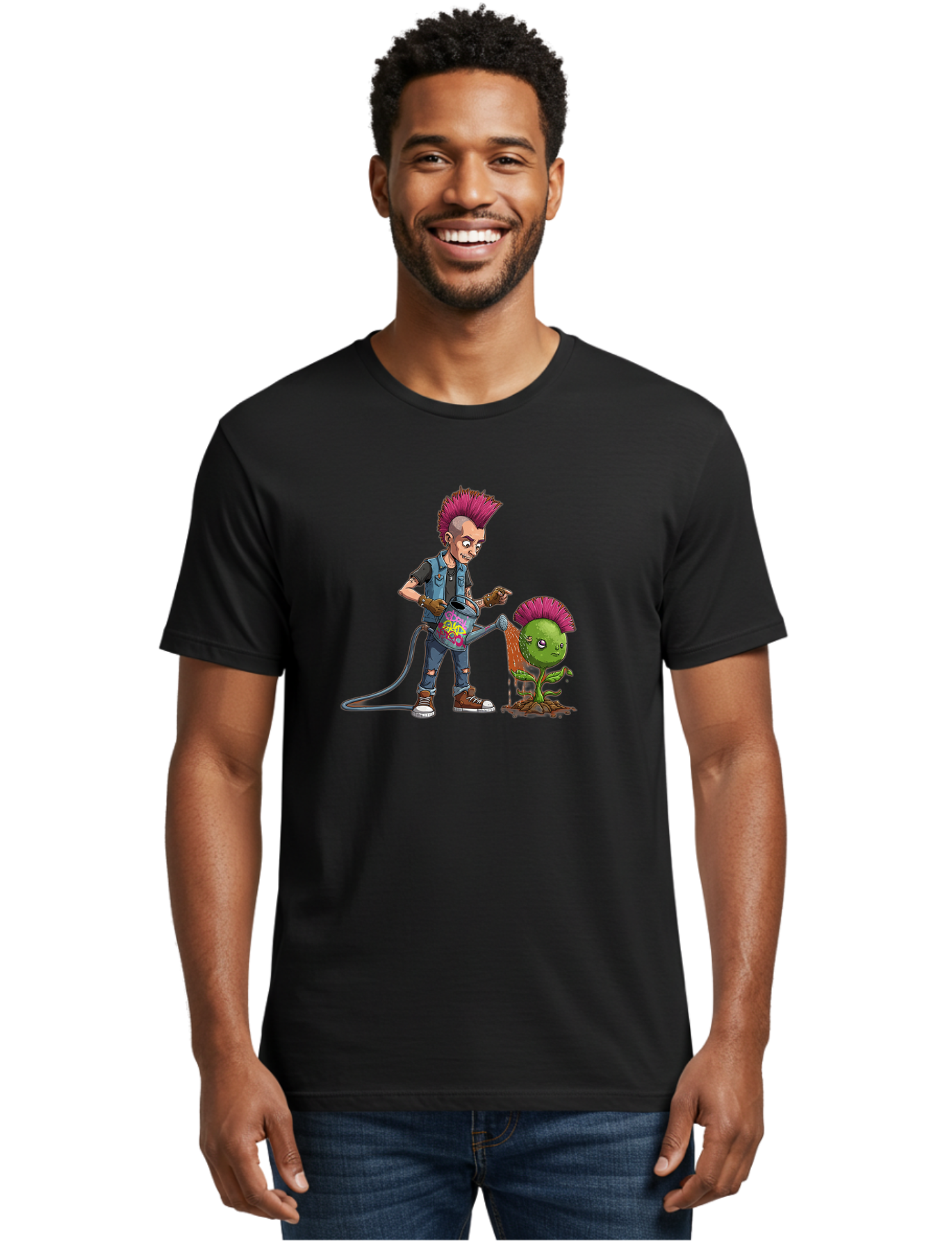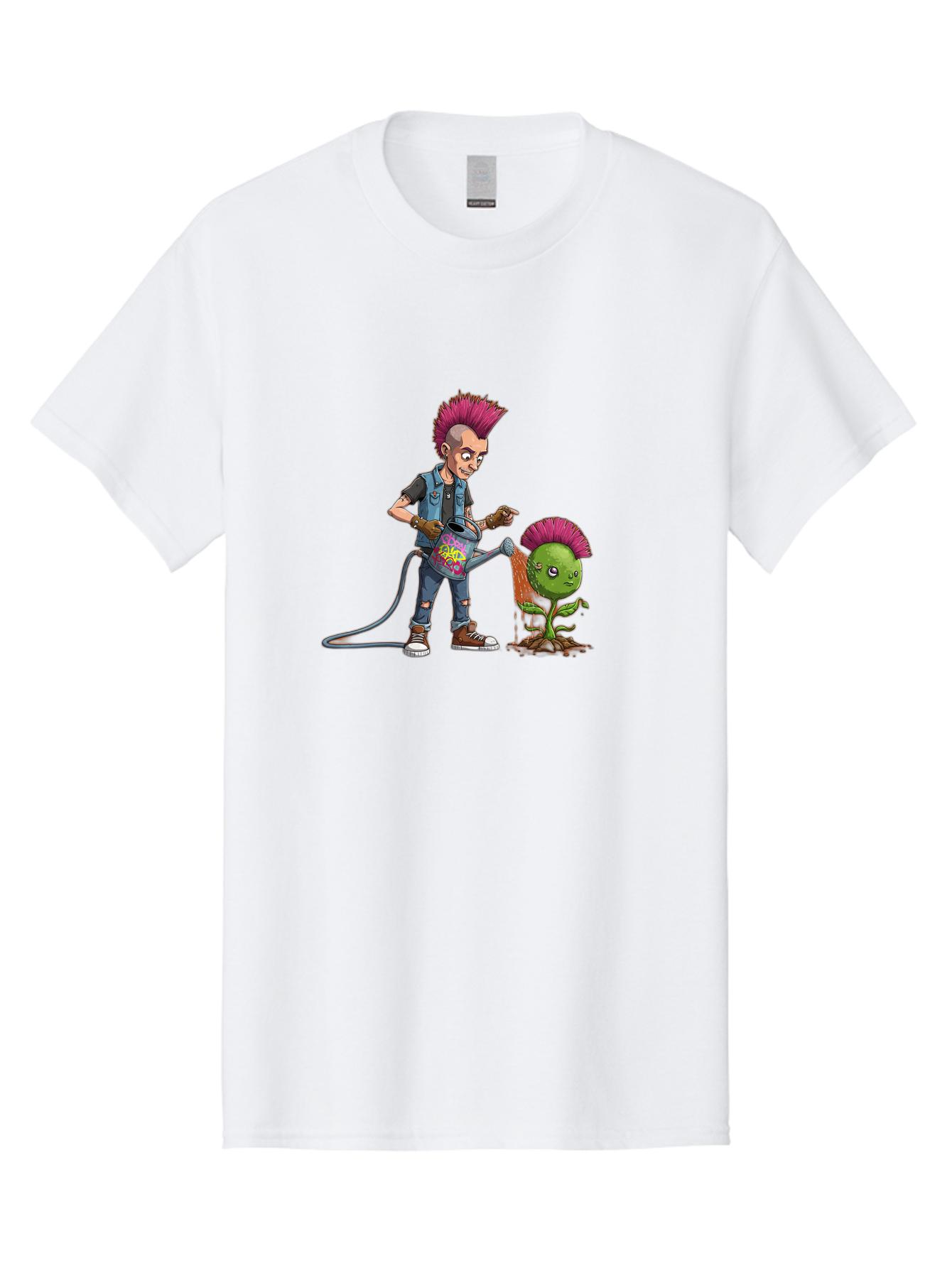 punk-watering-plant Men's Graphic Tee, 100% Cotton, Comfortable Casual Summer Wear, Machine Washable, punk rock character, mohawk hairstyle, watering can, graffiti art, punk plant, urban gardening, street culture, vibrant colors, alternative lifestyle, quirky illustration BAB260