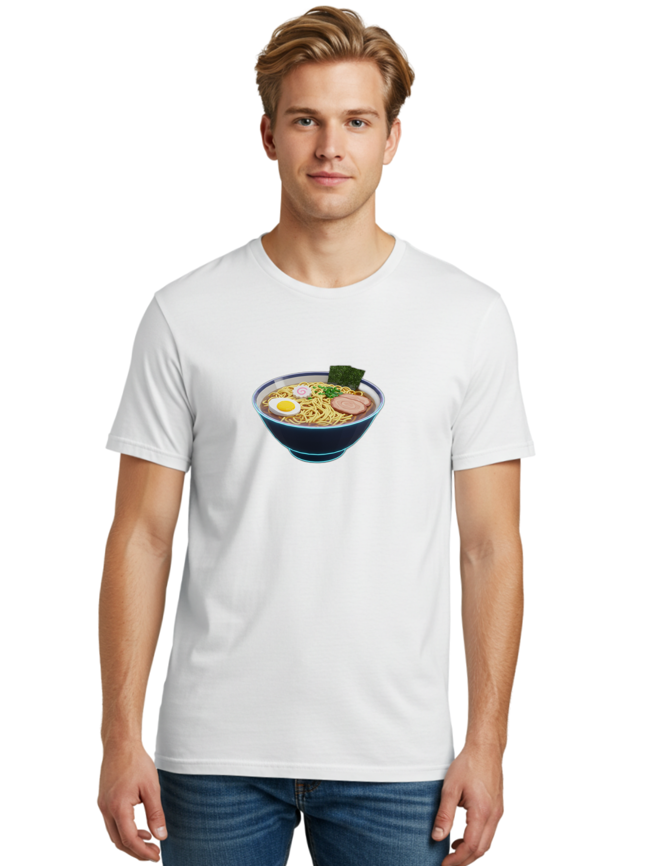 ramen-1 Men's Graphic Tee, 100% Cotton, Comfortable Casual Summer Wear, Machine Washable, steaming bowl of ramen noodles, slices of pork, boiled egg, seaweed, spring onions, Japanese cuisine, comfort food, savory broth, noodle soup, Asian flavors BAB275