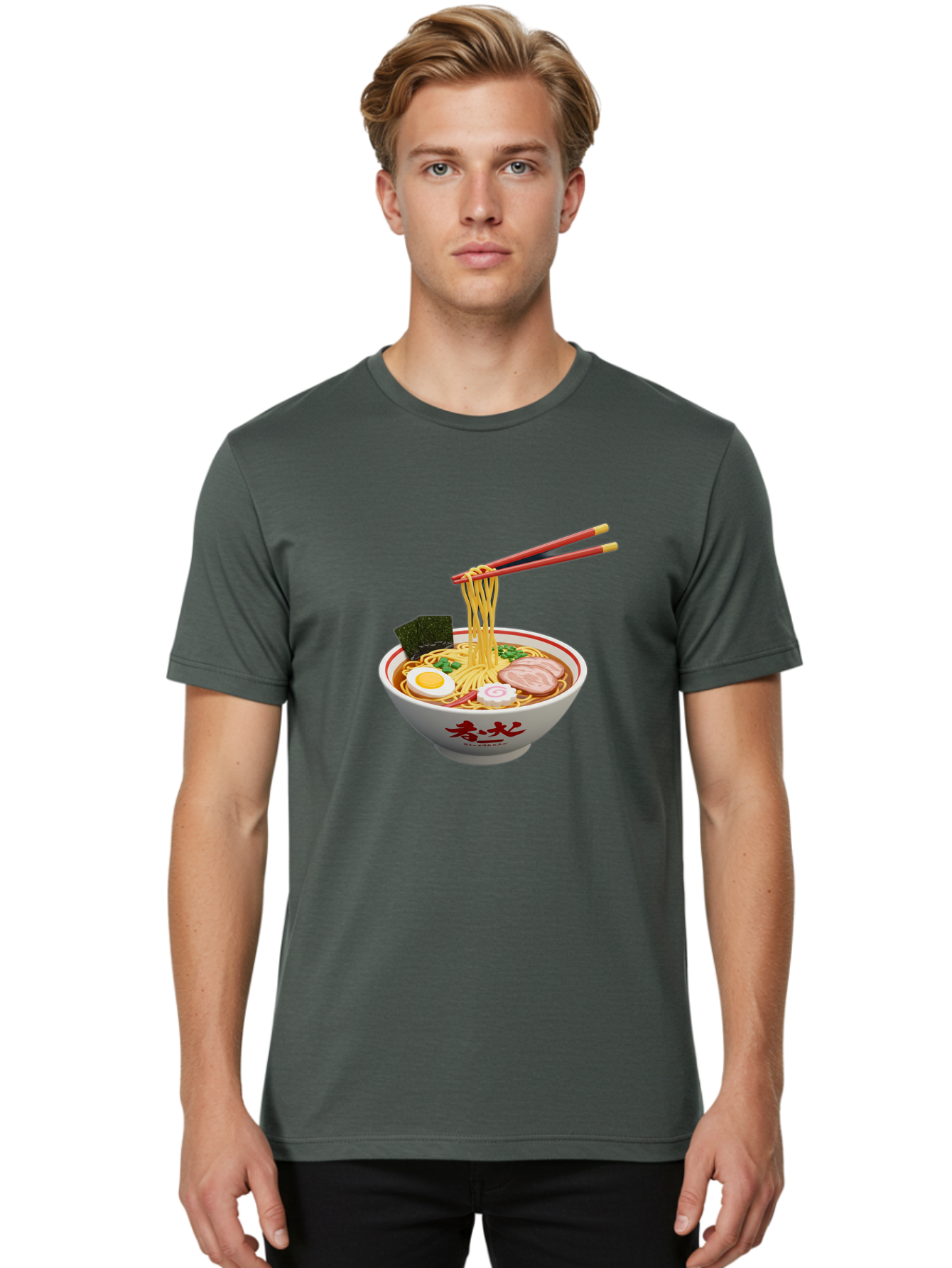 ramen-noodles-6 Men's Graphic Tee, 100% Cotton, Comfortable Casual Summer Wear, Machine Washable, steaming bowl of ramen, Japanese noodle soup, boiled egg, sliced pork, seaweed, green onions, chopsticks, Asian cuisine, savory broth, comfort food BAB314