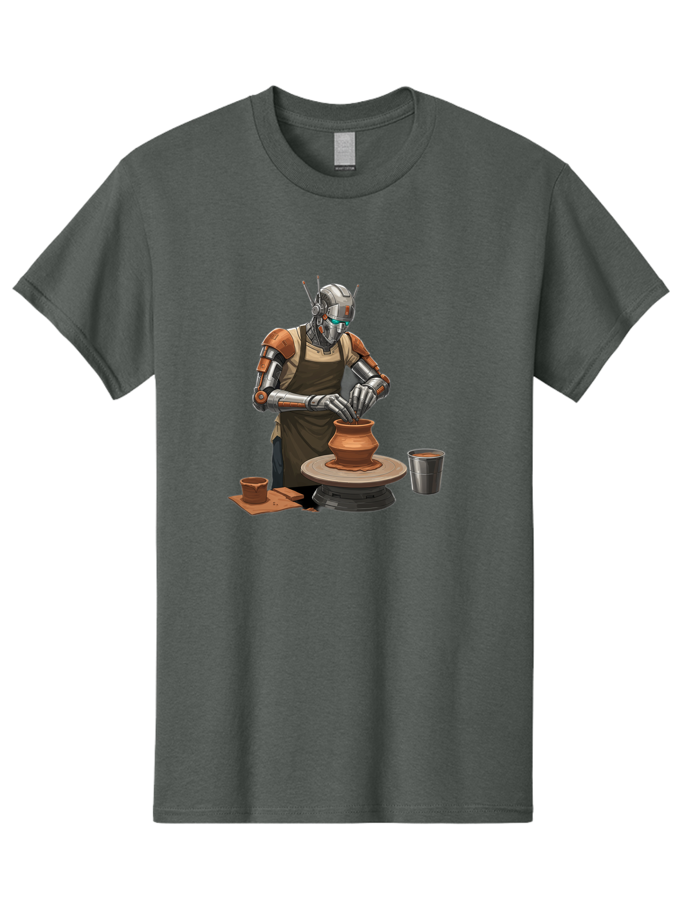 Robot-Potter Men'S Graphic Tee, 100% Cotton, Comfortable Casual Summer Wear, Machine Washable, Robot On Pottery Wheel, Clay Pot, Metal Cup, Robotic Hands, Creative Artwork, Futuristic Pottery, Artistic Creation, Mechanical Craftsmanship, Bab356