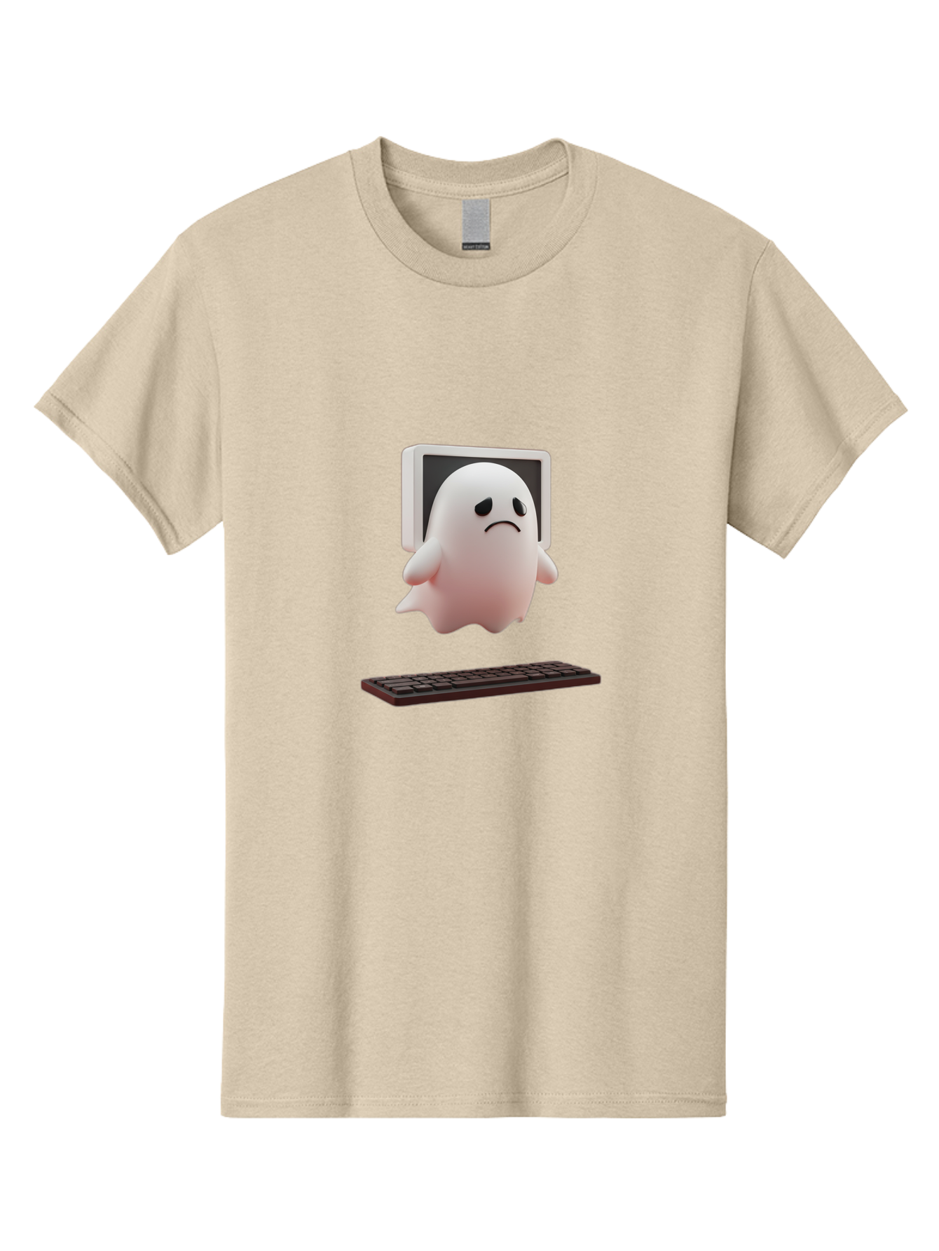 sad-ghost Men's Graphic Tee, 100% Cotton, Comfortable Casual Summer Wear, Machine Washable, sad ghost, unhappy facial expression, ghost character, computer monitor, keyboard, digital illustration, 3D rendering, cartoon ghost, frowning face BAB374