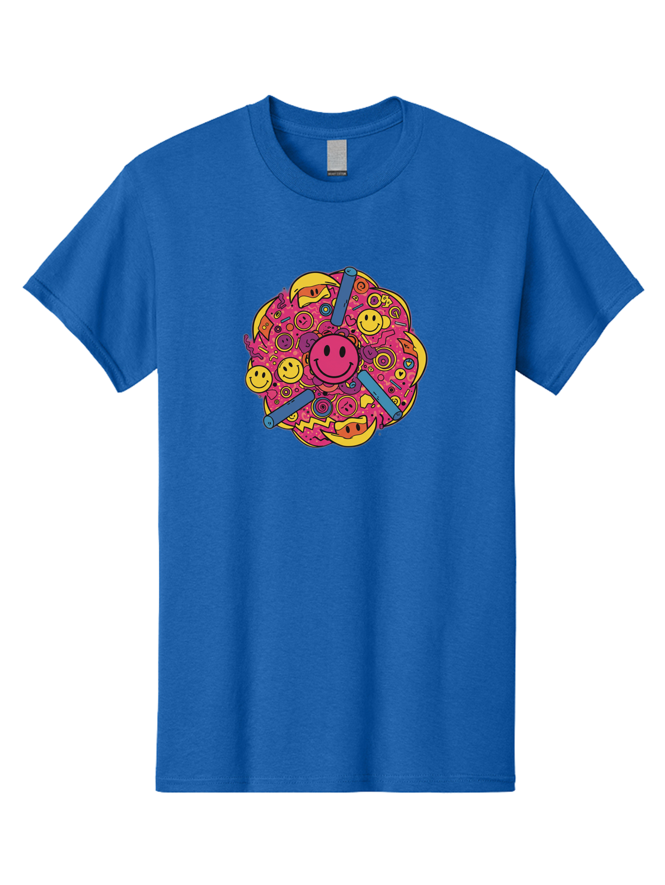 smiley-face-collage Men's Graphic Tee, 100% Cotton, Comfortable Casual Summer Wear, Machine Washable, happy face, smiling symbols, retro pop art, vibrant illustrations, playful design, colorful graphics, fun emojis, doodle art, happy vibes, emoticon graphics BAB404