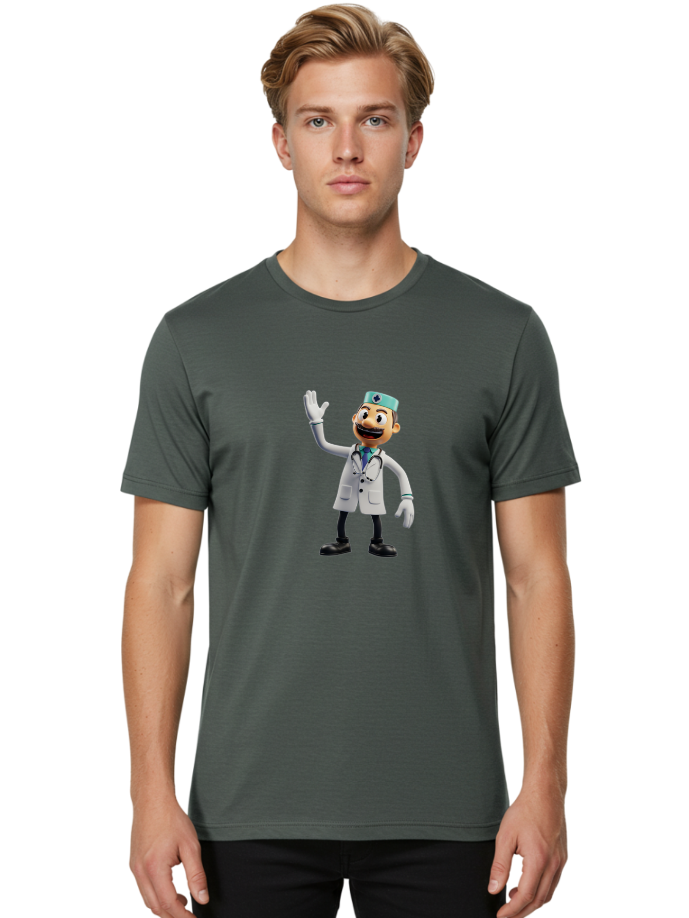 smiling-doctor-character Men's Graphic Tee, 100% Cotton, Comfortable Casual Summer Wear, Machine Washable, cartoon doctor, medical professional, friendly demeanor, white lab coat, stethoscope around neck, waving gesture, surgical cap, confident smile, healthcare worker BAB411
