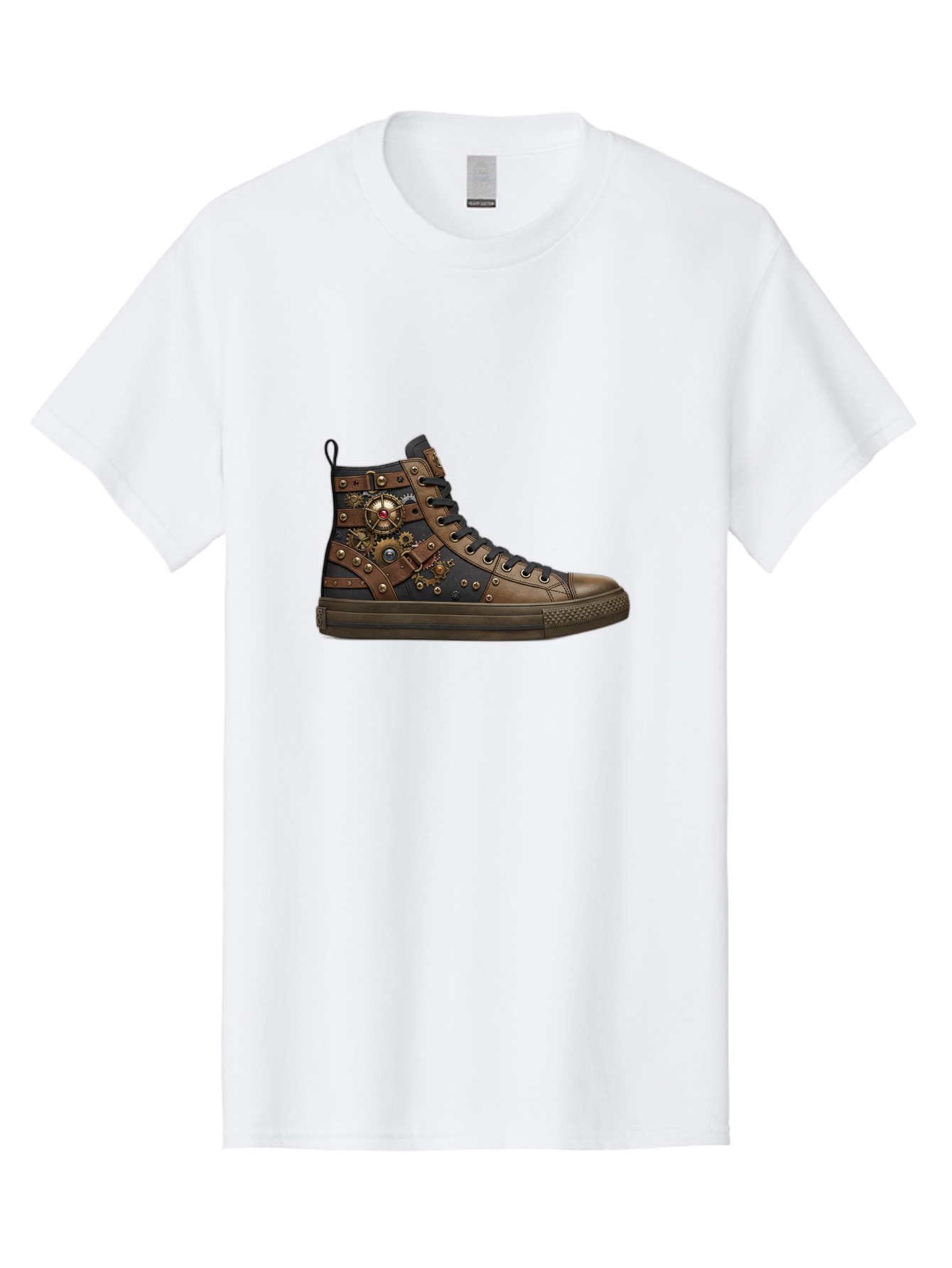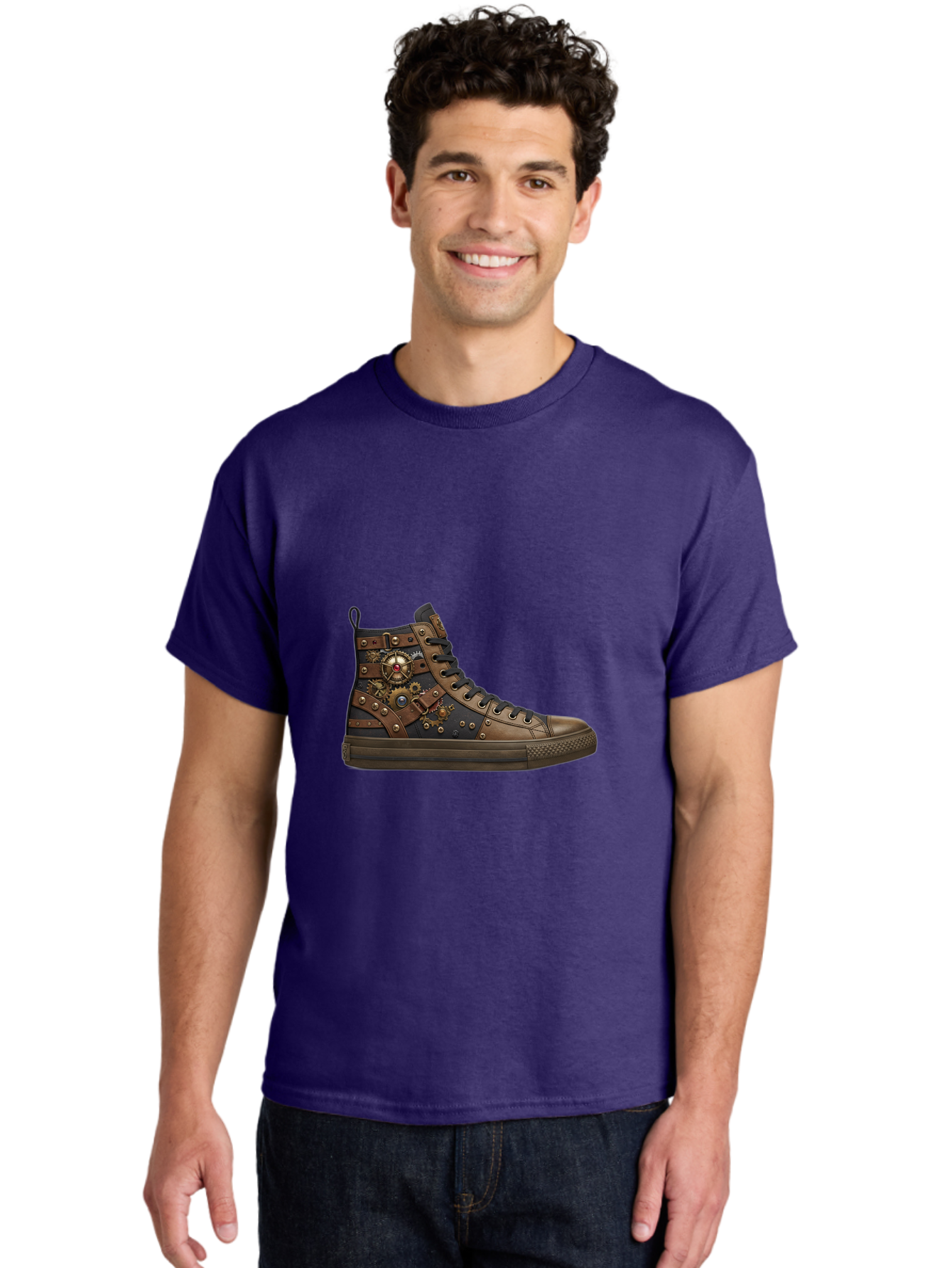 steampunk-sneaker Men's Graphic Tee, 100% Cotton, Comfortable Casual Summer Wear, Machine Washable, steampunk fashion, high-top sneaker, leather accents, industrial design, gear details, metal rivets, bold style, edgy look, unique footwear BAB463