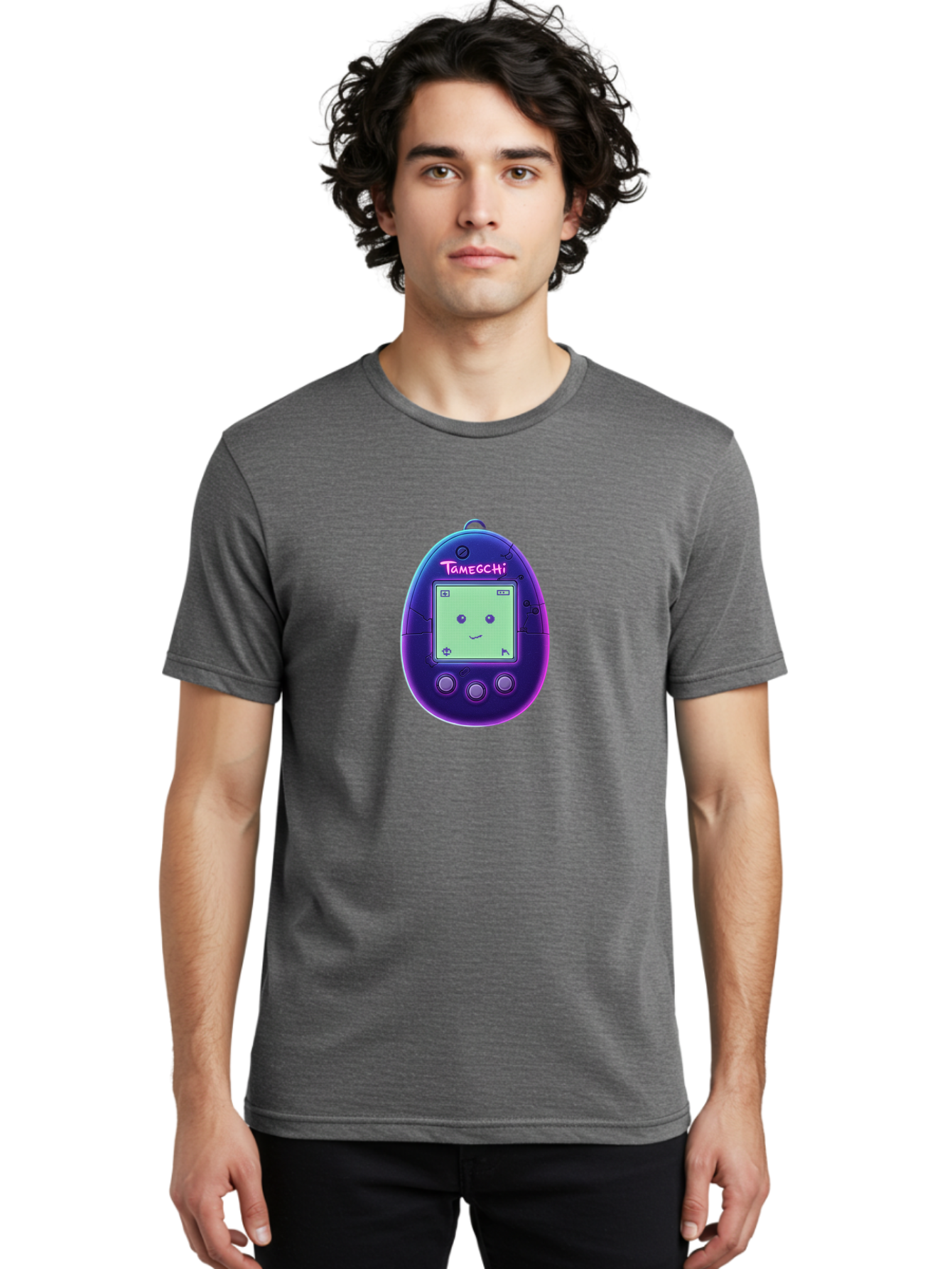 tamagotchi-4 Men's Graphic Tee, 100% Cotton, Comfortable Casual Summer Wear, Machine Washable, retro digital pet, handheld game, nostalgic tech, purple egg-shaped device, cute character, gaming nostalgia, 90s kids, retro gaming culture BAB498