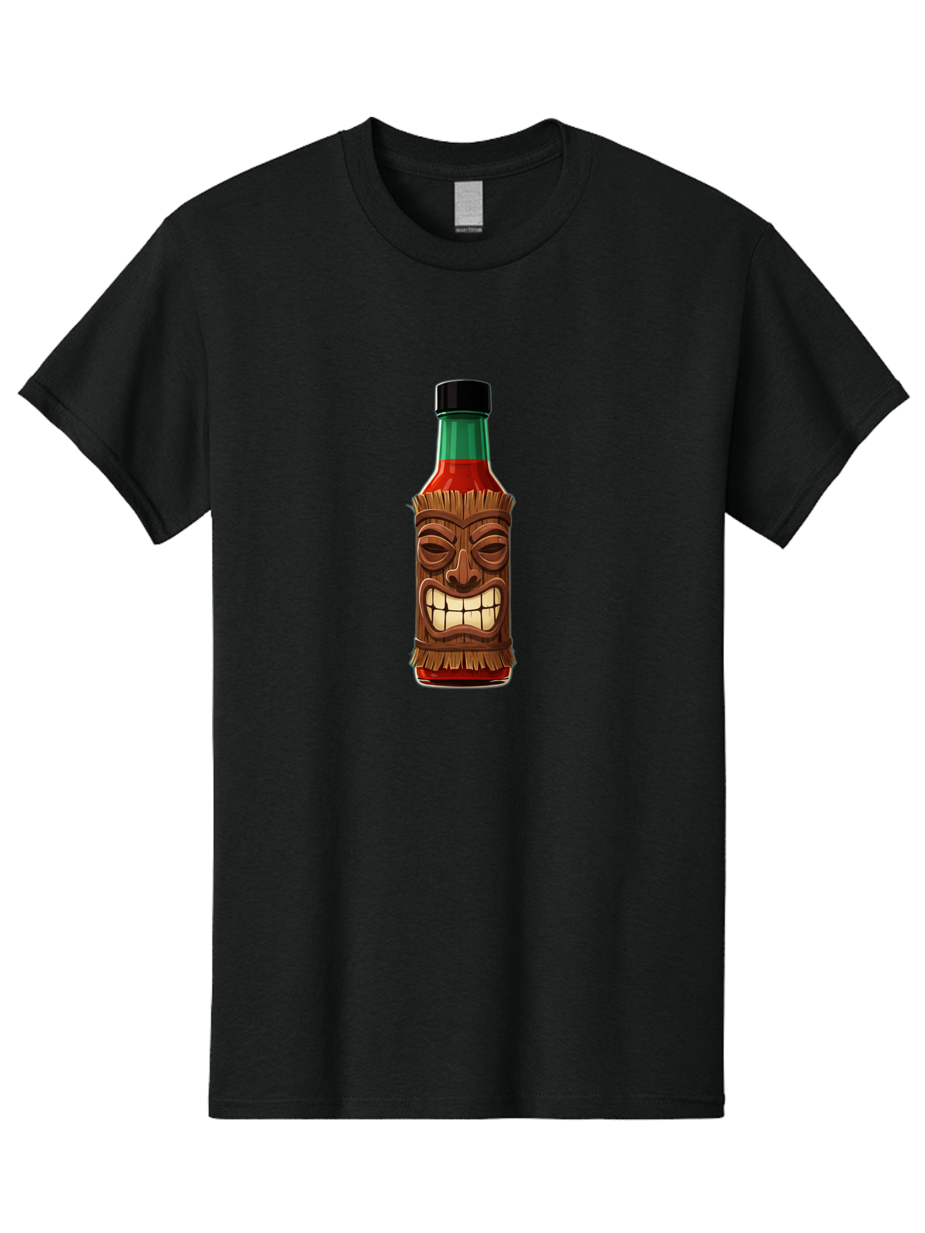 tiki-hot-sauce Men's Graphic Tee, 100% Cotton, Comfortable Casual Summer Wear, Machine Washable, hot sauce bottle, tiki face, wooden mask, cartoon illustration, spice bottle, condiment packaging, fiery sauce, humorous design, sauce container BAB537