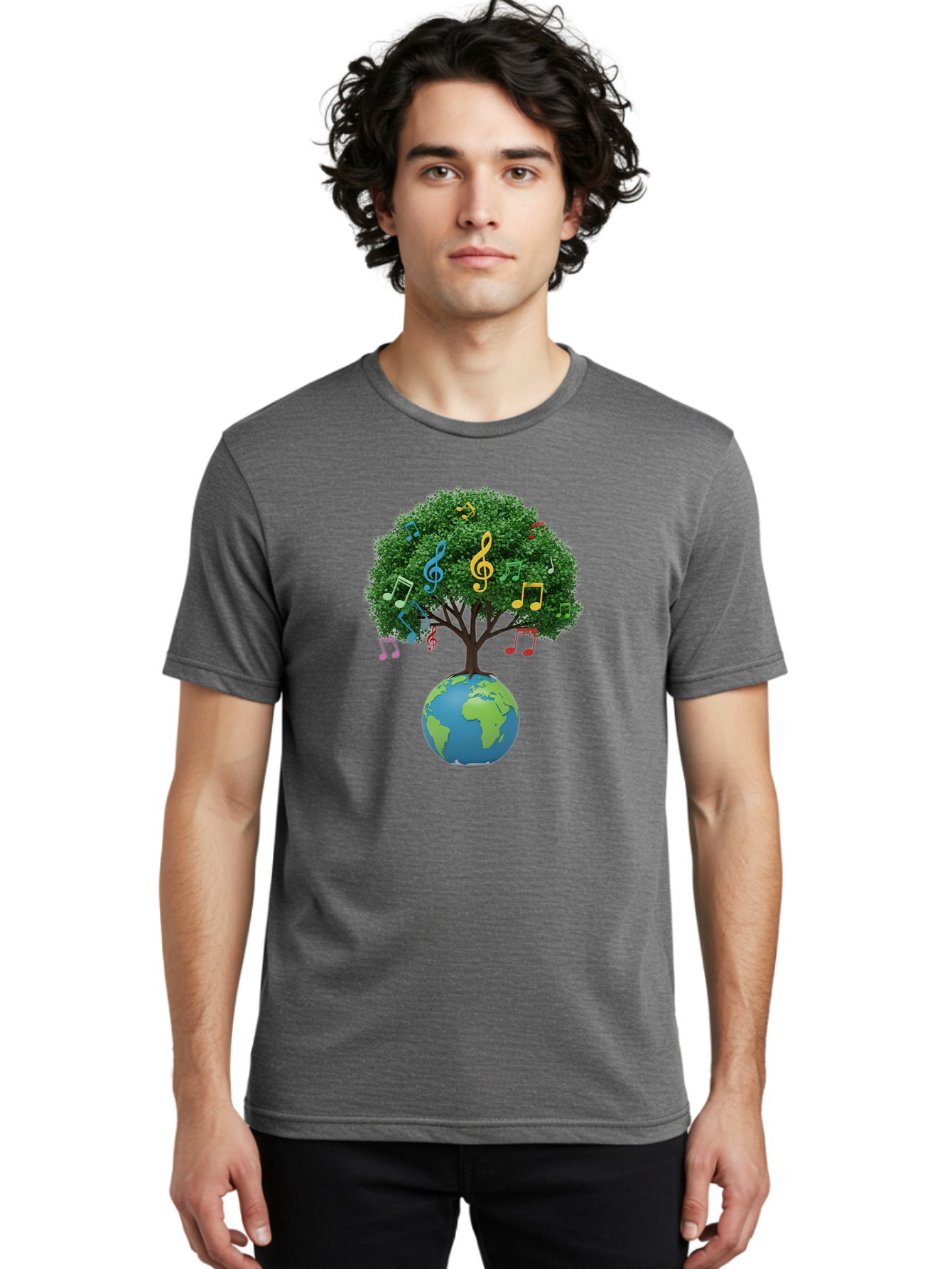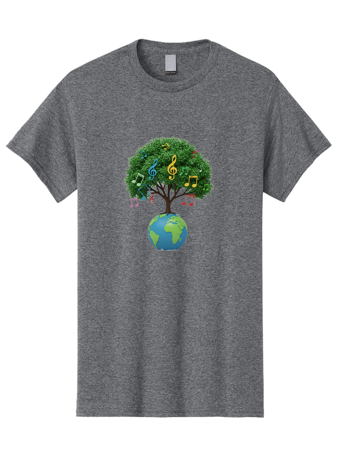 tree-of-music Men's Graphic Tee, 100% Cotton, Comfortable Casual Summer Wear, Machine Washable, tree growing out of the earth, global unity, music notes, treble clefs, harmony, world music, cultural diversity, environmentalism, creative expression BAB548