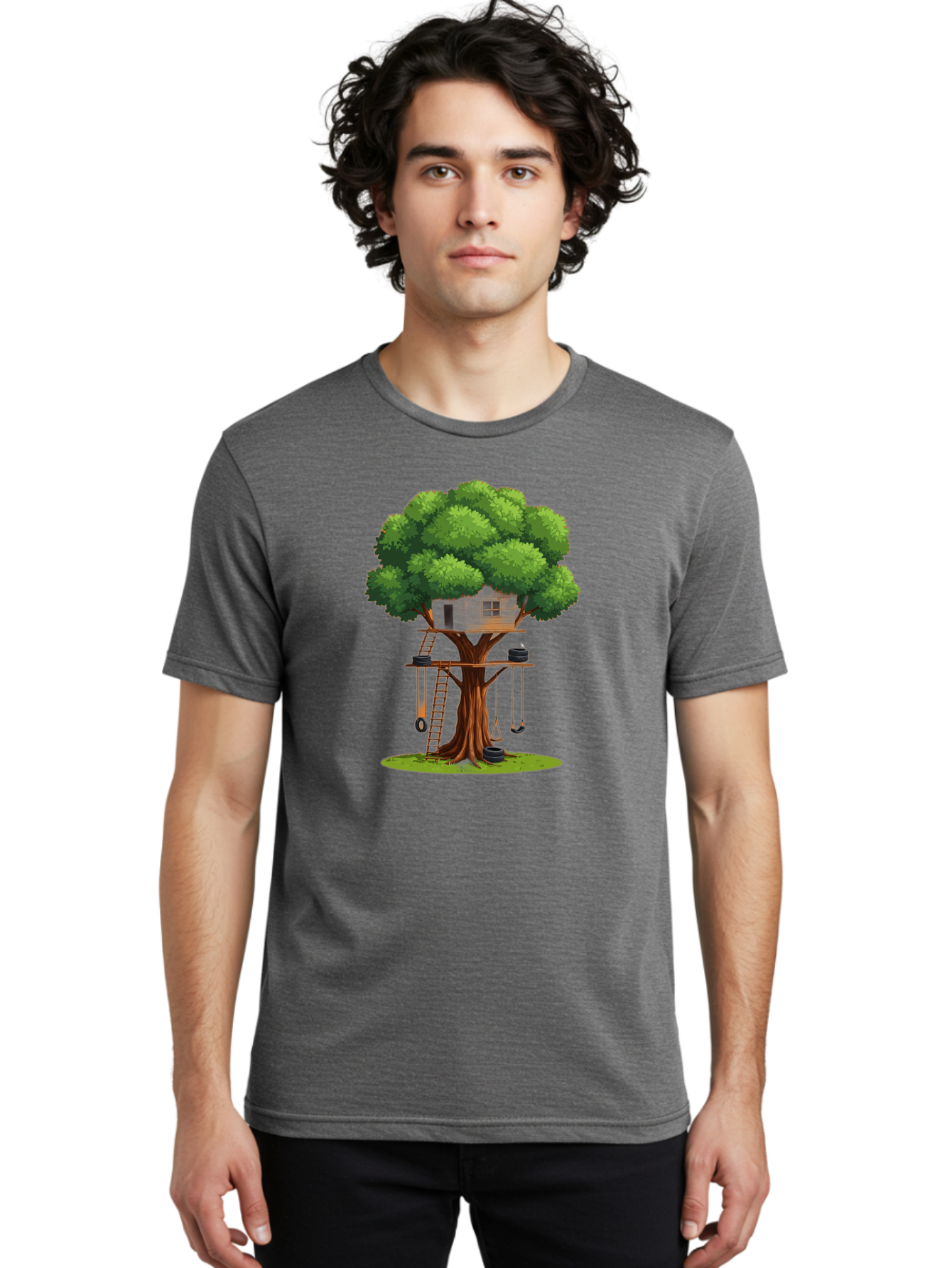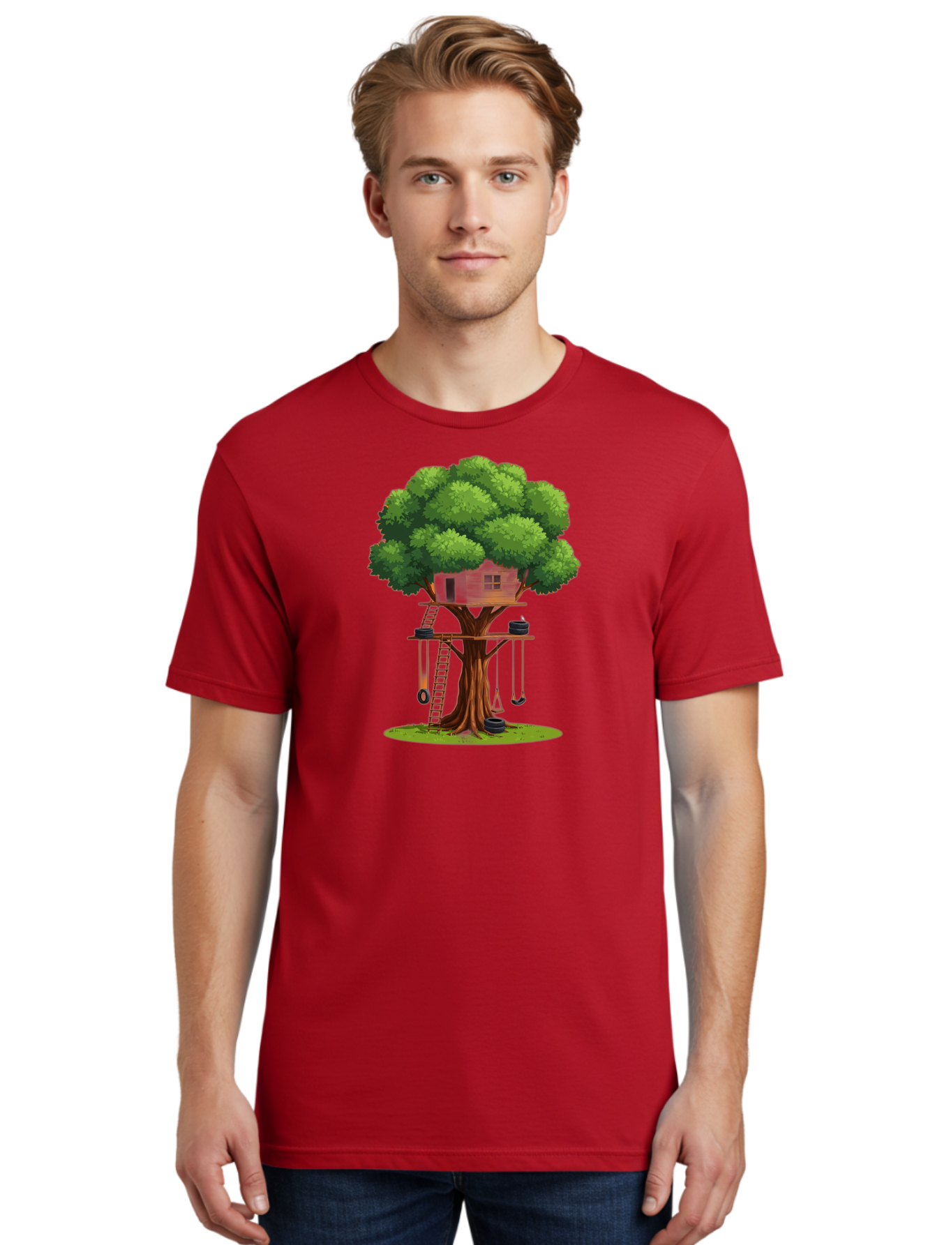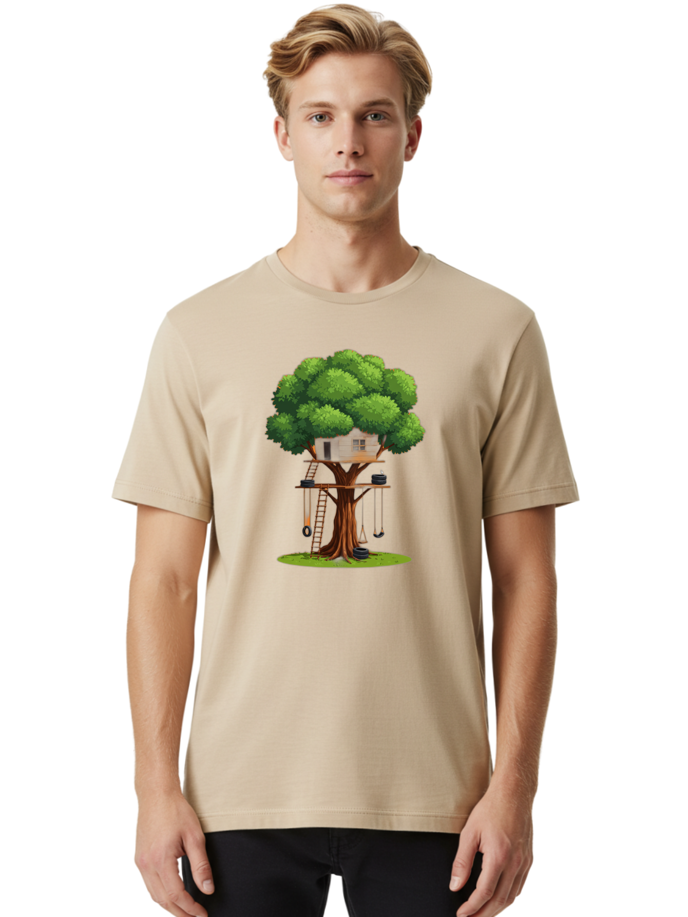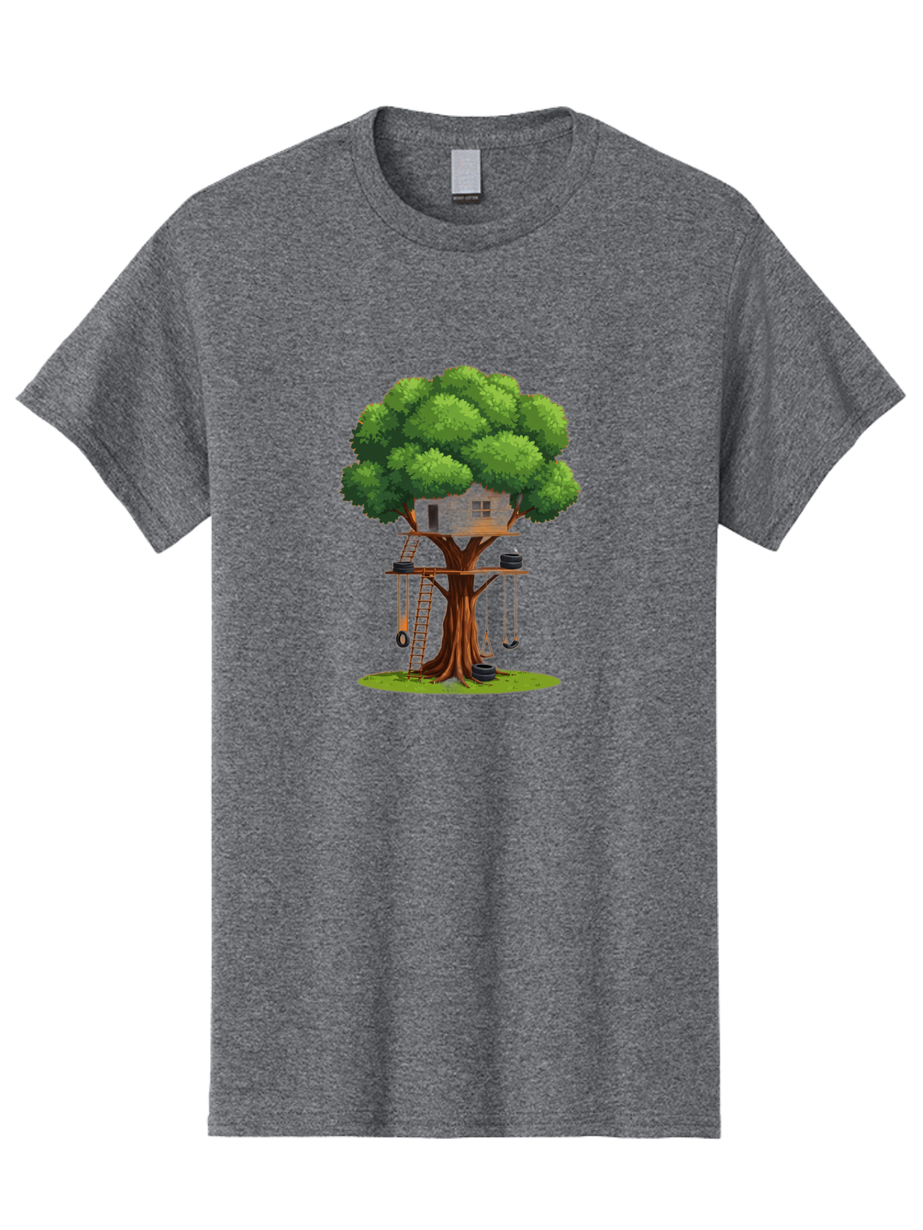 treehouse Men's Graphic Tee, 100% Cotton, Comfortable Casual Summer Wear, Machine Washable, treehouse in the tree, wooden ladder, rope swings, natural scenery, outdoor play, whimsical design, fantasy getaway, imaginative play, treehouse hideout BAB552