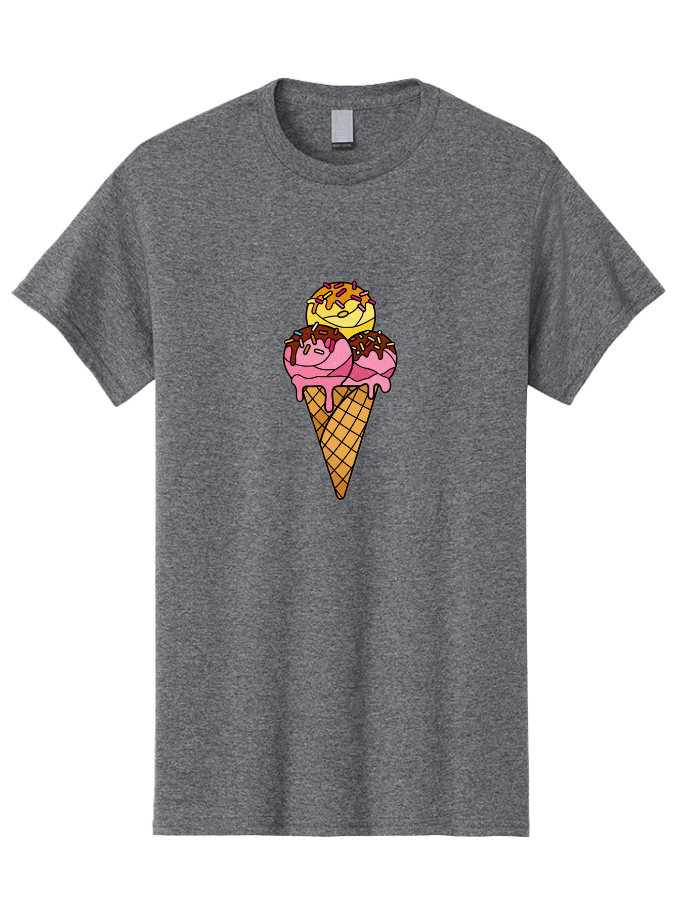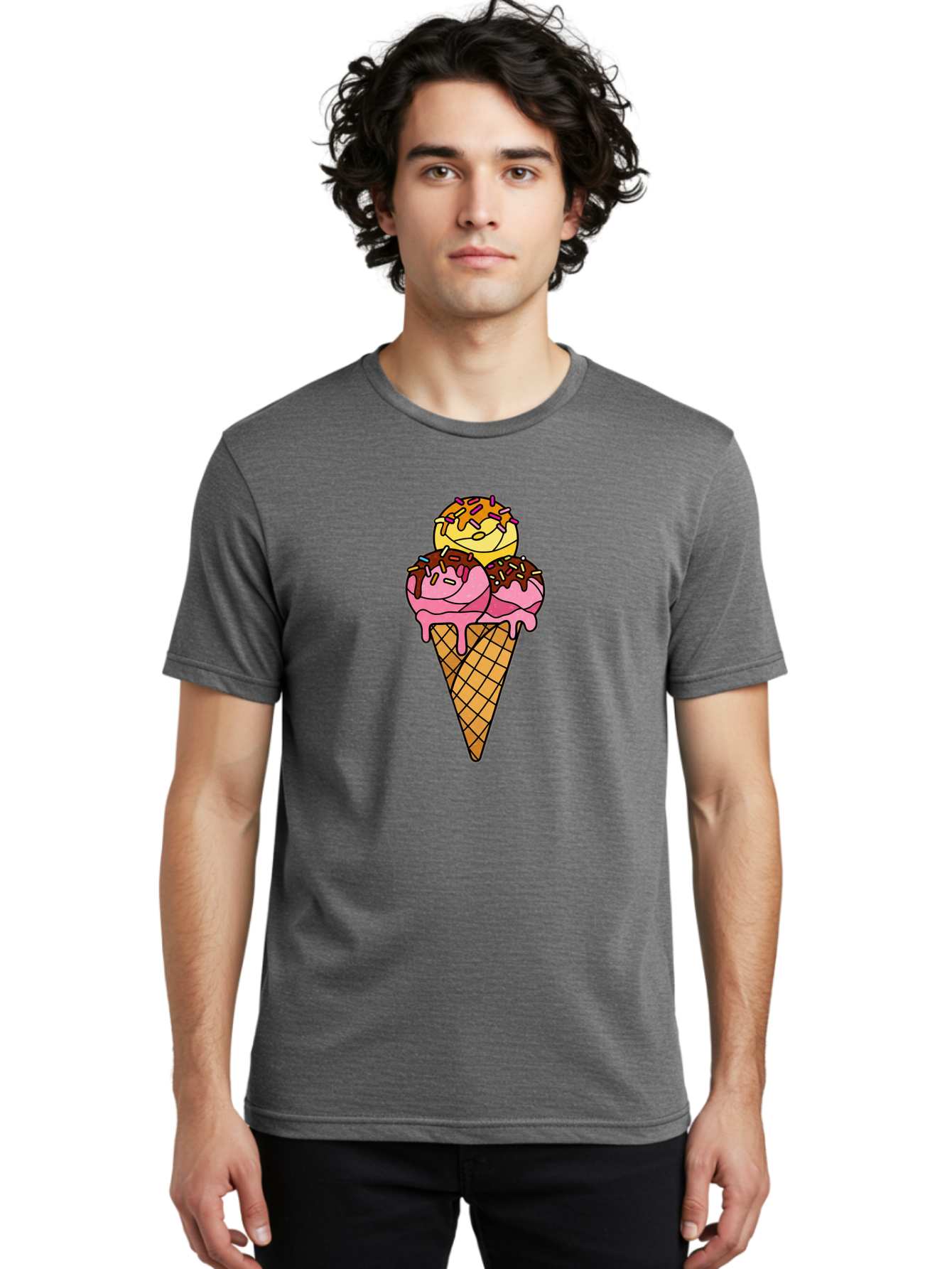 triple-scoop-ice-cream-2 Men's Graphic Tee, 100% Cotton, Comfortable Casual Summer Wear, Machine Washable, ice cream cone, sweet treats, dessert, melting ice cream, pink ice cream, chocolate drizzle, sprinkles, waffle cone BAB555