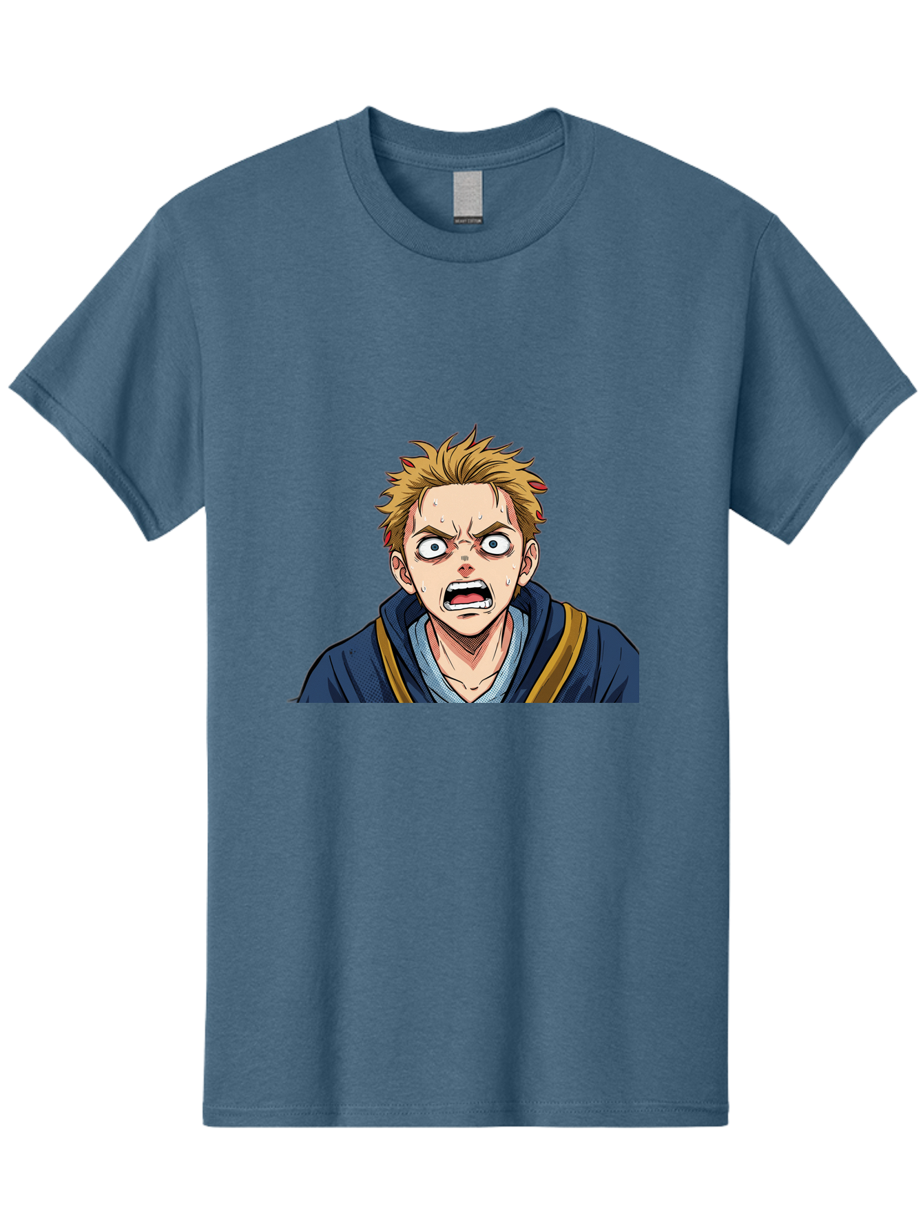 Angry-Anime-Boy Men'S Graphic Tee, 100% Cotton, Comfortable Casual Summer Wear, Machine Washable, Cartoon Character, Young Man, Blond Hair, Blue Hoodie, Shocked Expression, Wide-Eyed, Open-Mouthed, Intense Emotion, Dynamic Pose, Bab644