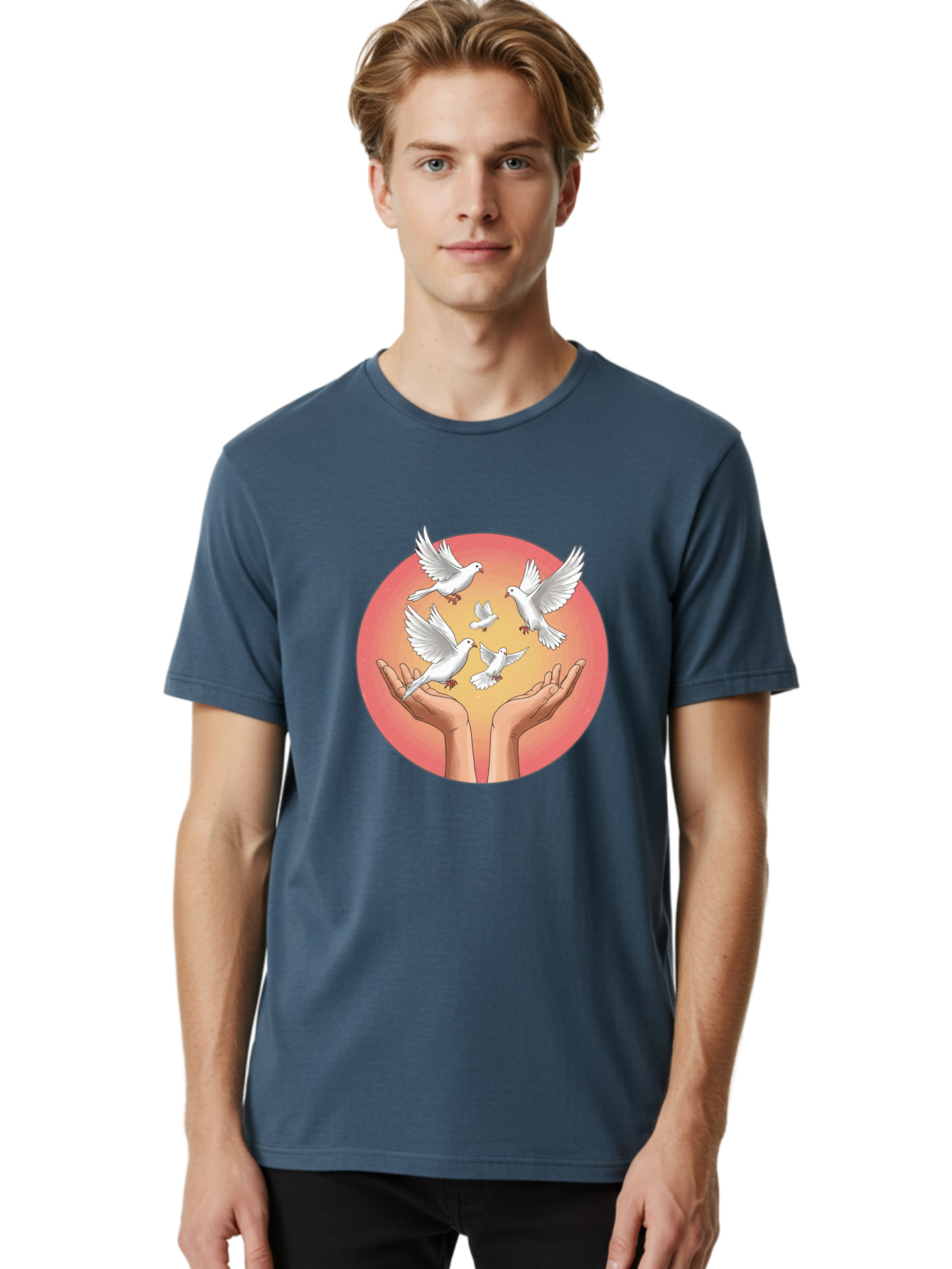 Hands-Releasing-Doves Men'S Graphic Tee, 100% Cotton, Comfortable Casual Summer Wear, Machine Washable, Doves Flying Away, Hands Releasing Birds, White Doves, Peaceful Release, Liberation, Freedom, Gentle Hands, Peaceful Atmosphere, Bac030
