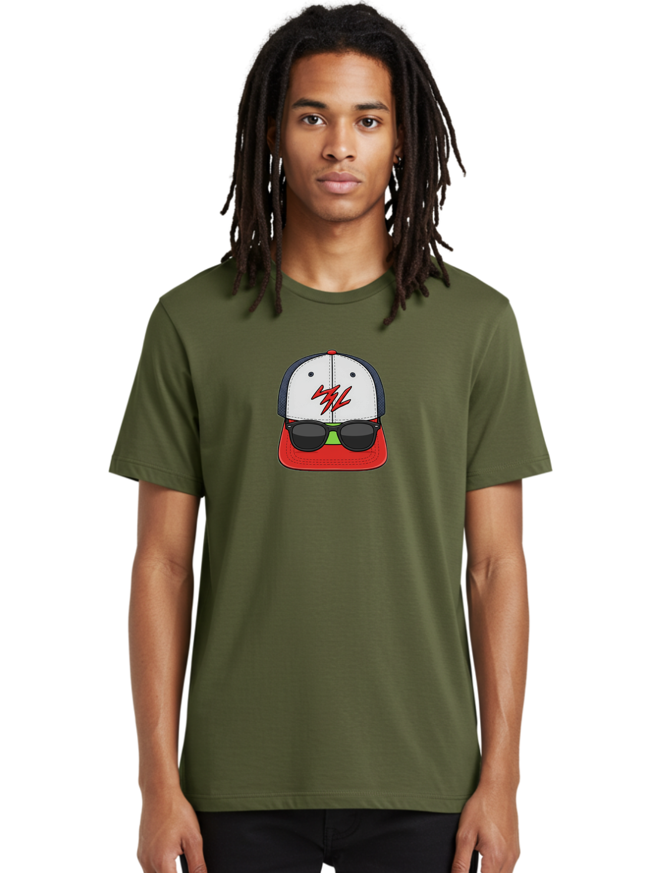 mlb-cap-sunglasses Men's Graphic Tee, 100% Cotton, Comfortable Casual Summer Wear, Machine Washable, baseball cap, sunglasses, red and white, MLB logo, stylized graphic, sports apparel, fashion accessory, trendy illustration, logo design, sports merchandise BAD329