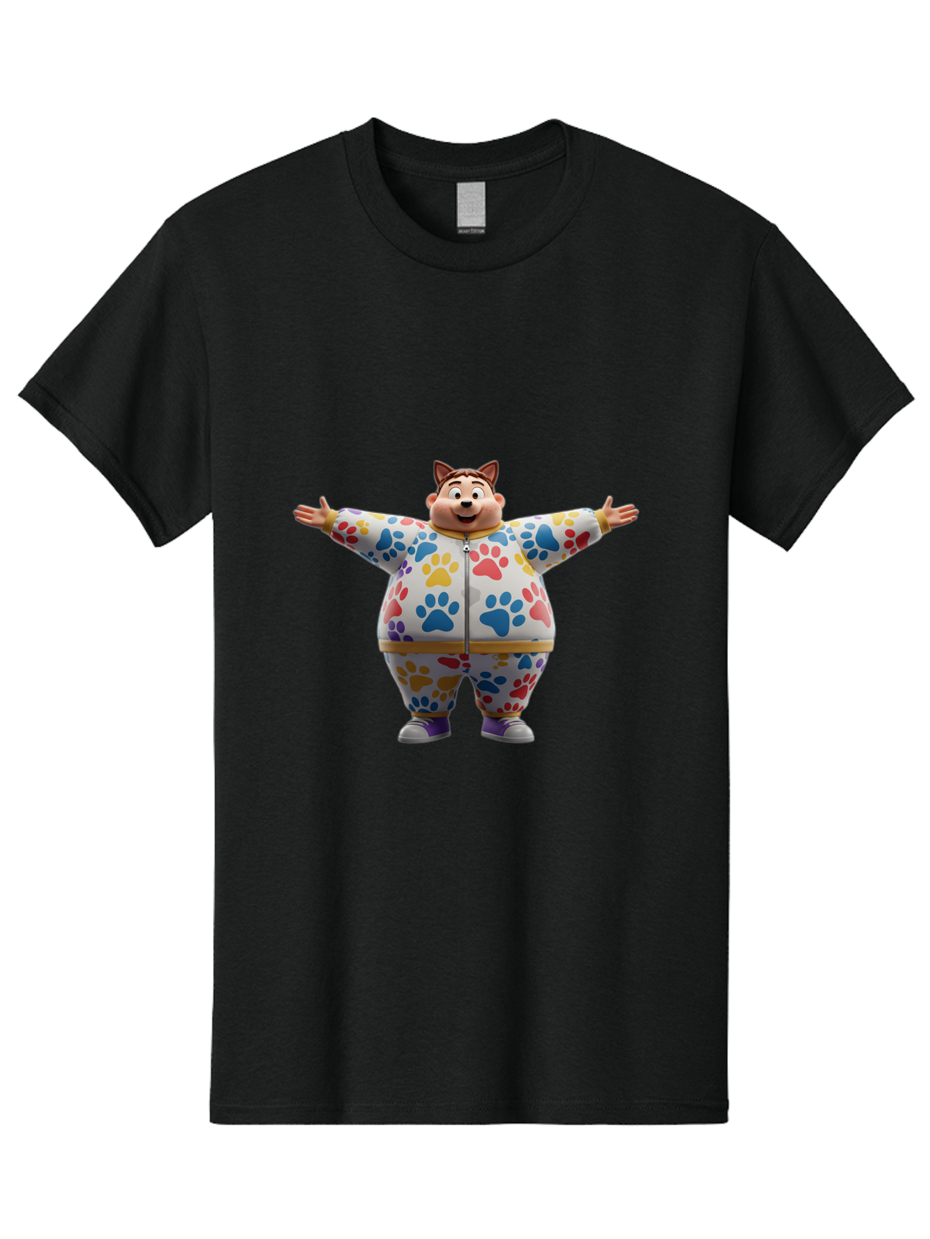 cat-ears-character Men's Graphic Tee, 100% Cotton, Comfortable Casual Summer Wear, Machine Washable, cartoon character, animal costume, colorful paw prints, white sweatsuit, open arms, cute expression, cartoon style, fun design, playful outfit, character illustration BAH702