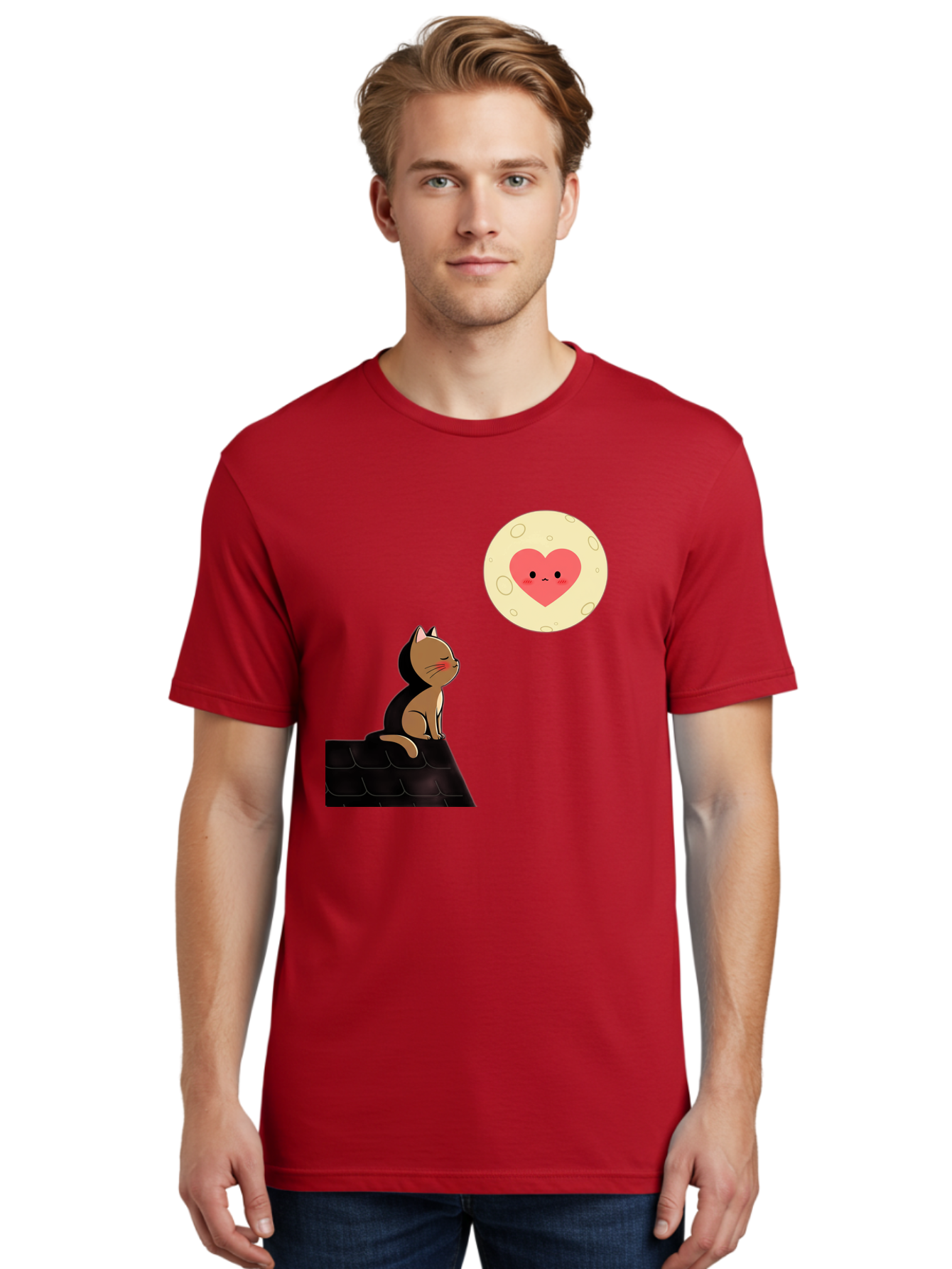 cat-loves-moon Men's Graphic Tee, 100% Cotton, Comfortable Casual Summer Wear, Machine Washable, cat on roof, gazing at moon, heart-shaped moon, whimsical scene, cute cartoon, adorable cat, peaceful night, love symbol, lunar charm BAI634