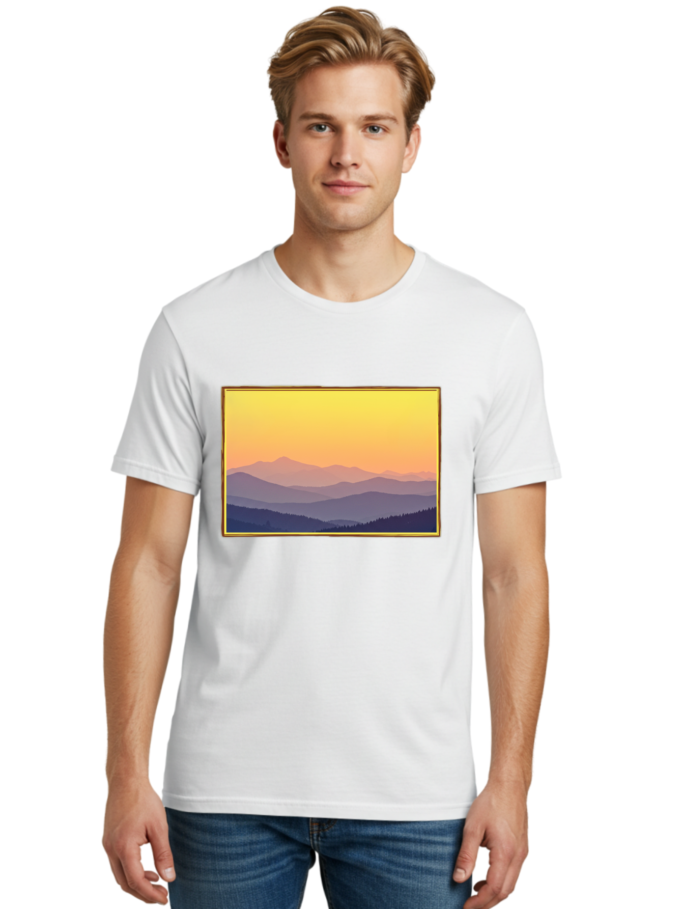 layered-mountains-at-sunset Men's Graphic Tee, 100% Cotton, Comfortable Casual Summer Wear, Machine Washable, layered mountains, serene landscape, warm yellow sky, gradient effect, peaceful atmosphere, silhouette of trees, natural scenery, outdoor beauty, mountain range BAK802